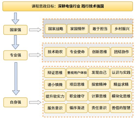 課程凝練了“深耕電信行業(yè),踐行技術(shù)強(qiáng)國”的思政目標(biāo),并從國家強(qiáng)、專業(yè)強(qiáng)及自身強(qiáng)三個(gè)層面挖掘思政元素。全課思政元素如下圖1所示。