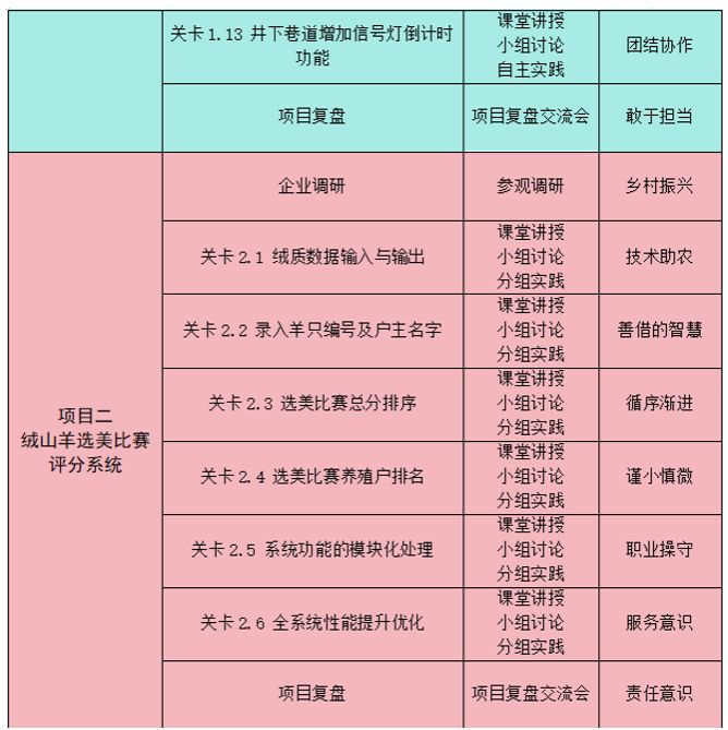 本課程以項(xiàng)目式開展教學(xué),在項(xiàng)目開展前,通過組織學(xué)生深入企業(yè)參觀調(diào)研,了解企業(yè)的技術(shù)現(xiàn)狀和需求,讓學(xué)生帶著“如何用程序設(shè)計(jì)技術(shù)解決企業(yè)實(shí)際問題”的任務(wù),了解企業(yè)在發(fā)展中遇到的技術(shù)難題。例如,在與鄂爾多斯敏蓋絨山羊養(yǎng)殖園區(qū)調(diào)研時(shí),充分了解企業(yè)在產(chǎn)業(yè)數(shù)據(jù)管理、流程優(yōu)化等方面的需求。在課堂講解需求分析時(shí),結(jié)合調(diào)研所得的企業(yè)需求,引導(dǎo)學(xué)生認(rèn)識(shí)到程序設(shè)計(jì)不僅是技術(shù)層面的工作,更是要對(duì)社會(huì)需求負(fù)責(zé)。在項(xiàng)目開展中,通過設(shè)計(jì)“問題”,來增加學(xué)生的職業(yè)素養(yǎng)。例如在設(shè)計(jì)絨山羊選美比賽評(píng)分系統(tǒng)可能出現(xiàn)的數(shù)據(jù)誤差問題,讓學(xué)生明白一個(gè)小小的程序漏洞可能影響比賽的公正性,進(jìn)而影響產(chǎn)業(yè)的健康發(fā)展,從而強(qiáng)化學(xué)生的社會(huì)責(zé)任感,將社會(huì)責(zé)任感轉(zhuǎn)化為專業(yè)學(xué)習(xí)和實(shí)踐的動(dòng)力。在項(xiàng)目結(jié)束后,組織項(xiàng)目復(fù)盤討論會(huì)并邀請(qǐng)企業(yè)指導(dǎo)教師參與,讓學(xué)生在反思自身實(shí)踐不足的同時(shí),還能從企業(yè)視角理解感悟行業(yè)對(duì)專業(yè)技能與職業(yè)素養(yǎng)的要求。