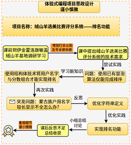 以絨山羊選美比賽評(píng)分系統(tǒng)實(shí)現(xiàn)排名功能、思政點(diǎn)“謹(jǐn)小慎微”為例,詳細(xì)描述思政元素融入過程,下圖2案例流程圖。