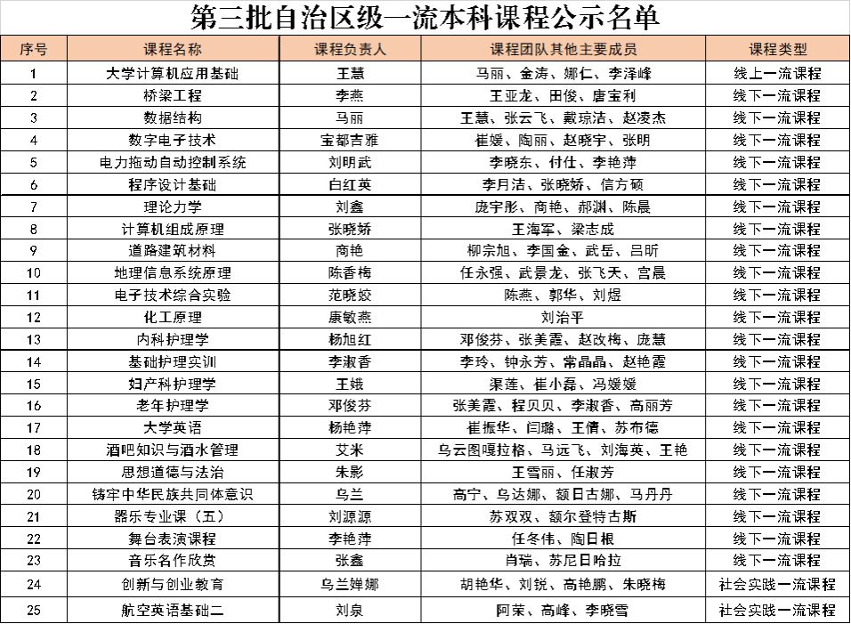 根據內蒙古自治區教育廳《關于第三批自治區級一流本科課程認定結果的公示》,學校25門課程被認定為本批次自治區級一流本科課程。其中,線上課程1門,線下課程22門,社會實踐課程2門。(第三批自治區級一流本科課程公示名單可見附件)