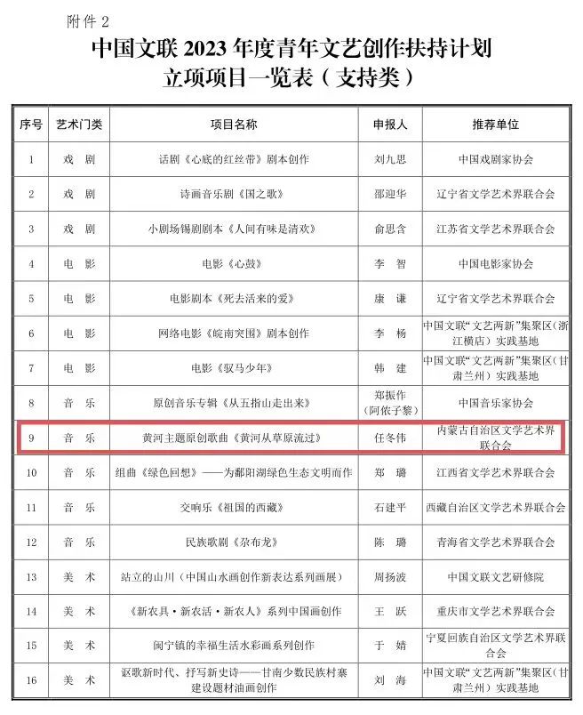 8月16日,中國(guó)文聯(lián)公示2023年度青年文藝創(chuàng)作扶持計(jì)劃擬立項(xiàng)名單,67個(gè)項(xiàng)目包括36項(xiàng)資助類(lèi)項(xiàng)目,31項(xiàng)支持類(lèi)項(xiàng)目。我校藝術(shù)系教師任冬偉申報(bào)的黃河主題原創(chuàng)歌曲《黃河從草原流過(guò)》,擬獲得青年文藝創(chuàng)作扶持計(jì)劃支持。