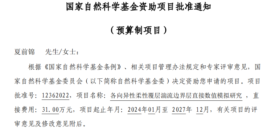 夏前錦教授負責的項目《各向異性柔性覆層湍流邊界層直接數值模擬研究》,是繼我校任春副教授2021年立項的《基于等效靜態轉化法的薄壁結構大變形碰撞拓撲優化方法研究》、李大旭教授2022年立項的《全健康視域下黃河幾字灣地區過敏性鼻炎與水文氣象環境的多中心隊列和健康管理策略研究——以鄂爾多斯為例》之后,第三個獲批國家自然科學基金的科研項目。