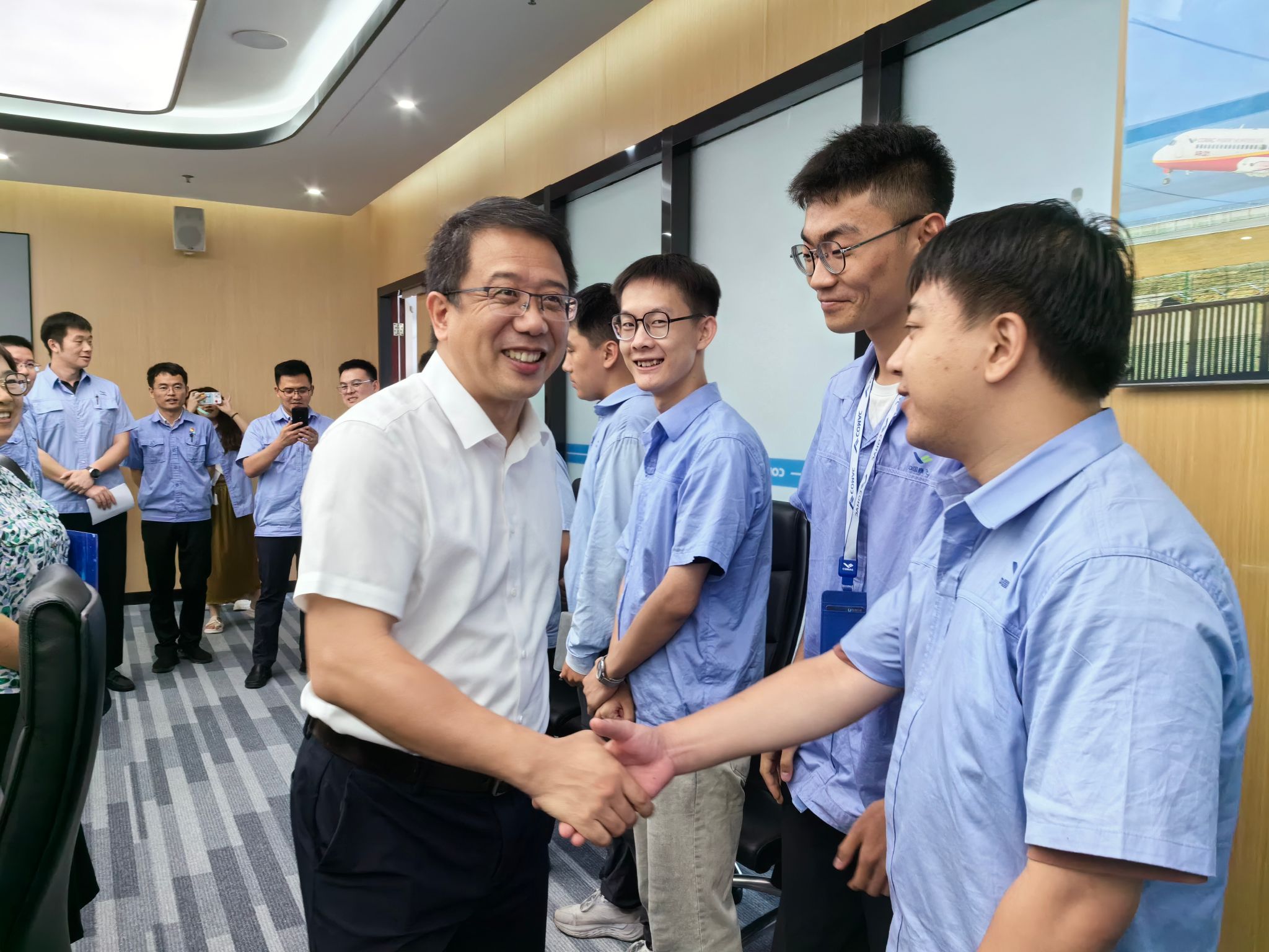 座談會后,宮箭與學校黨政辦負責人、大飛機學院負責人來到入職上飛公司的畢業生當中,與大家親切交流,詳細了解畢業生的工作生活情況,鼓勵學生秉承“長期奮斗、長期攻關、長期吃苦、長期奉獻”的商飛精神,樹立“勞模精神、勞動精神、工匠精神”,激發報國熱情,強化使命擔當,為國產大飛機發展貢獻力量。