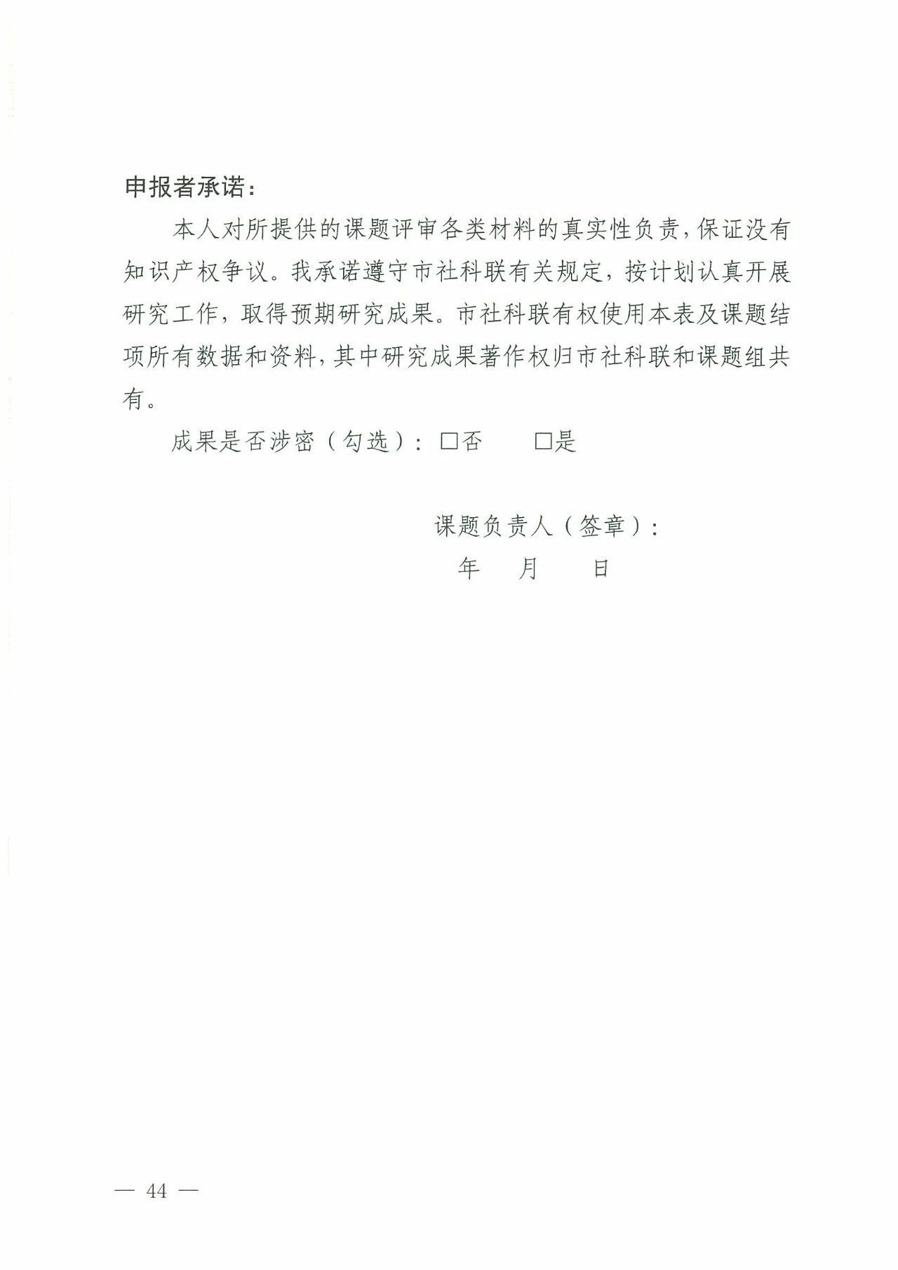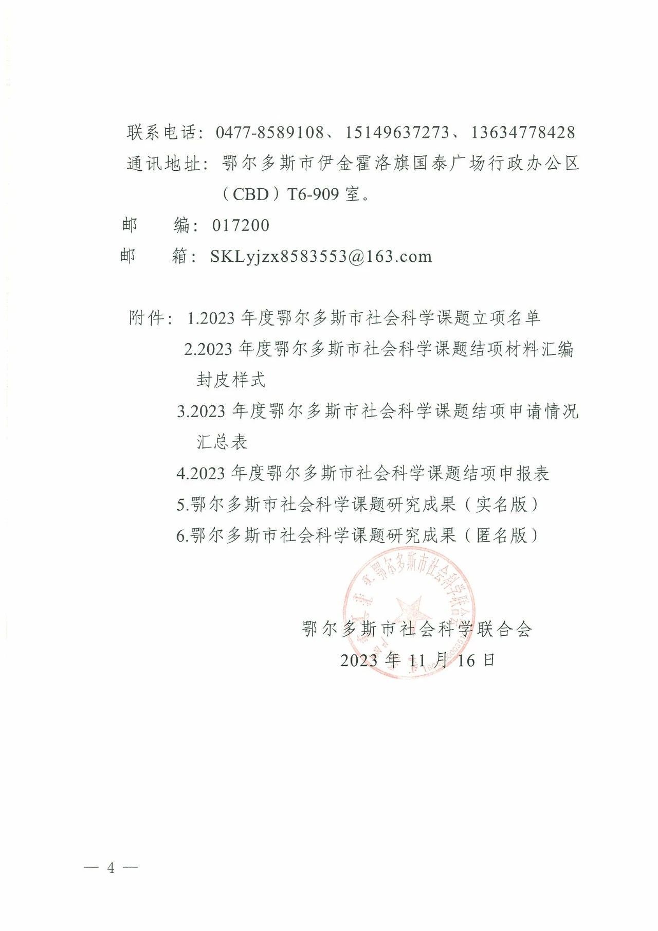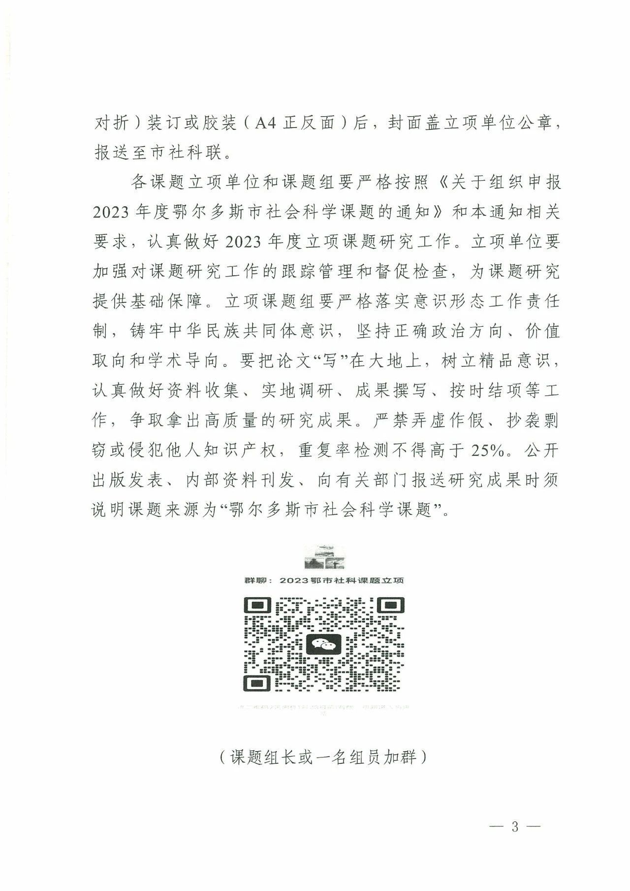 根據(jù)2023年度全市哲學社會科學工作安排部署,市社科聯(lián)印發(fā)了《關于組織申報2023年度鄂爾多斯市社會科學課題的通知》(鄂社聯(lián)發(fā)〔2023〕17號),組織市內外廣大專家學者申報2023年度鄂爾多斯市社會科學課題。11月11日,市社科聯(lián)黨組召開第27次(擴大)會議,研究確定“馬克思主義哲學原理視野下的‘習近平新時代中國特色社會主義思想’”“做好現(xiàn)代能源經(jīng)濟這篇文章、構筑世界級能源產(chǎn)業(yè)”等537個課題為2023年度鄂爾多斯市社會科學課題立項課題(附件1)。2023年度“鄂爾多斯市社會科學課題”立項課題,結合課題組自主申報情況,提交結項材料的時間確定為2024年6月1日至15日。各課題組要按照規(guī)定時限提交以下五項結項材料的電子版和紙質版(電子版到鄂爾多斯社會科學網(wǎng)“通知公告欄”下載),即《2023年度鄂爾多斯市社會科學課題結項申請情況匯總表》(附件3,使用Excel表格,由立項單位統(tǒng)一匯總)、《2023年度鄂爾多斯市社會科學課題結項申報表》(附件4,蓋章)、結項研究成果實名版(附件5)、結項研究成果匿名版(附件6)和知網(wǎng)查重報告(不接受查重率超過25%的課題結項申請)。上述五項結項材料電子版以立項單位名義發(fā)送至鄂爾多斯市社科聯(lián)SKLyjzx8583553@163.com郵箱,郵件“主題”模式為“立項單位+課題數(shù)+課題負責人姓名”。上述五項結項材料紙質版按順序整理成冊并加裝封皮(附件2),采用騎馬釘(A3對折)裝訂或膠裝(A4正反面)后,封面蓋立項單位公章,報送至市社科聯(lián)。各課題立項單位和課題組要嚴格按照《關于組織申報2023年度鄂爾多斯市社會科學課題的通知》和本通知相關要求,認真做好2023年度立項課題研究工作。立項單位要加強對課題研究工作的跟蹤管理和督促檢查,為課題研究提供基礎保障。立項課題組要嚴格落實意識形態(tài)工作責任制,鑄牢中華民族共同體意識,堅持正確政治方向、價值取向和學術導向。要把論文“寫”在大地上,樹立精品意識,認真做好資料收集、實地調研、成果撰寫、按時結項等工作,爭取拿出高質量的研究成果。嚴禁弄虛作假、抄襲剽竊或侵犯他人知識產(chǎn)權,重復率檢測不得高于25%。公開出版發(fā)表、內部資料刊發(fā)、向有關部門報送研究成果時須說明課題來源為“鄂爾多斯市社會科學課題”。