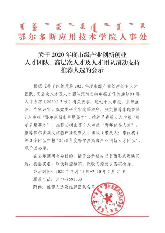 關于2020年度市級產業創新創業人才團隊、高層次人才及人才團隊滾動支持推薦人選的公示