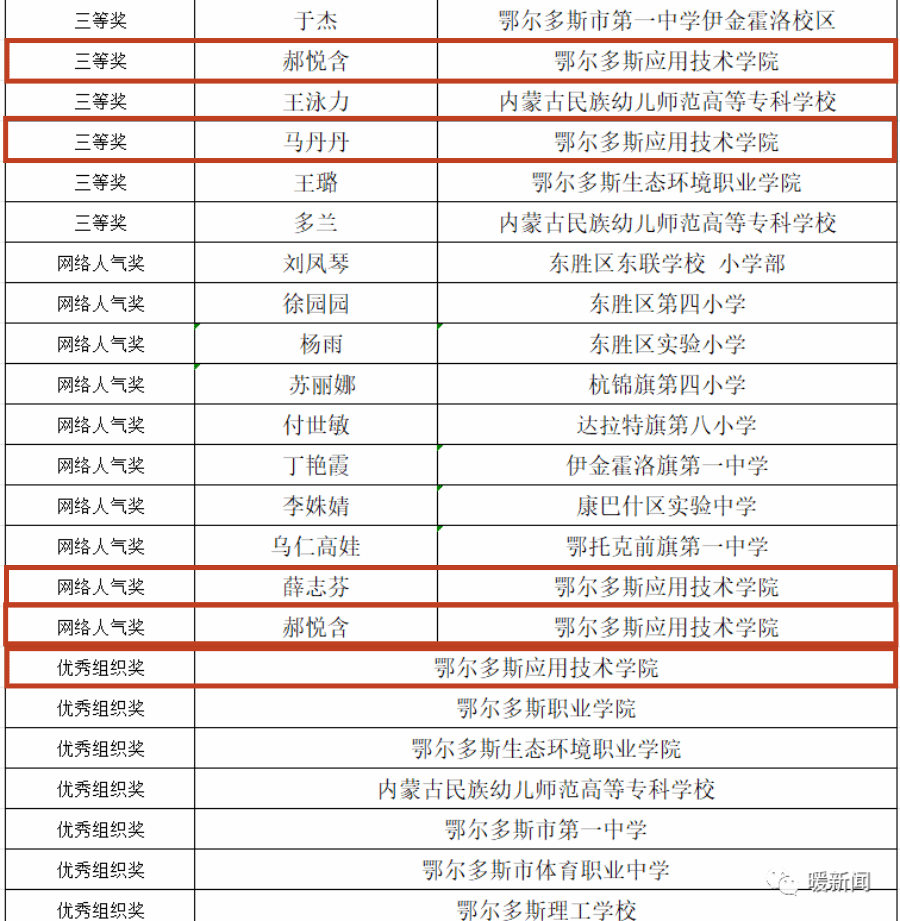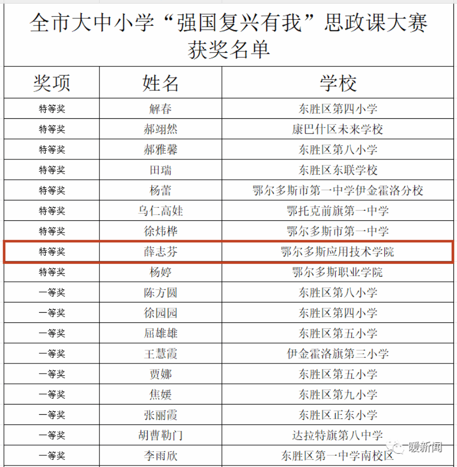 11月2日,全市大中小學(xué)“強(qiáng)國復(fù)興有我”思政課大賽決賽落下帷幕,共有96名教師參加此次決賽,經(jīng)過激烈角逐,我校五位教師在決賽中發(fā)揮出色,最終獲得特等獎1名、一等獎1名、二等獎1名、三等獎2名、網(wǎng)絡(luò)人氣獎2名的好成績。學(xué)校榮獲優(yōu)秀組織獎。此次大賽是由鄂爾多斯市宣傳部、文明辦、教育體育局、人力資源和社會保障局聯(lián)合開展的一次規(guī)模較大的教學(xué)展示競賽活動,是鄂爾多斯市深化“大思政課”建設(shè)、增強(qiáng)立德樹人“大思政課”作用的實(shí)踐探索,具有很強(qiáng)的示范效果。