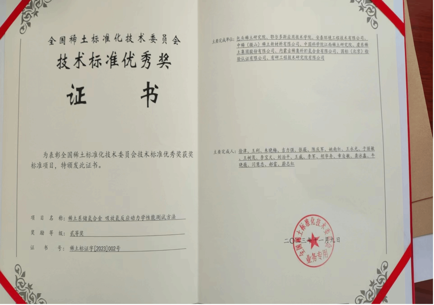 本次全國稀土標(biāo)準(zhǔn)化技術(shù)委員會(huì)技術(shù)標(biāo)準(zhǔn)優(yōu)秀獎(jiǎng)一等獎(jiǎng)1項(xiàng),二等獎(jiǎng)2項(xiàng),三等獎(jiǎng)3項(xiàng)。鄂爾多斯應(yīng)用技術(shù)學(xué)院參與編訂的國家標(biāo)準(zhǔn)《稀土系儲(chǔ)氫合金 吸放氫反應(yīng)動(dòng)力學(xué)性能測試方法》獲得了二等獎(jiǎng)。學(xué)校參與的國標(biāo)《固態(tài)儲(chǔ)氫用稀土系儲(chǔ)氫合金》通過審定。2024年度,學(xué)校將參與國標(biāo)《稀土系儲(chǔ)氫合金吸放氫循環(huán)壽命測試方法》和行業(yè)標(biāo)準(zhǔn)《稀土鎂基儲(chǔ)氫合金吸放氫反應(yīng)熱力學(xué)性能測試 范德霍夫法》的編制工作。