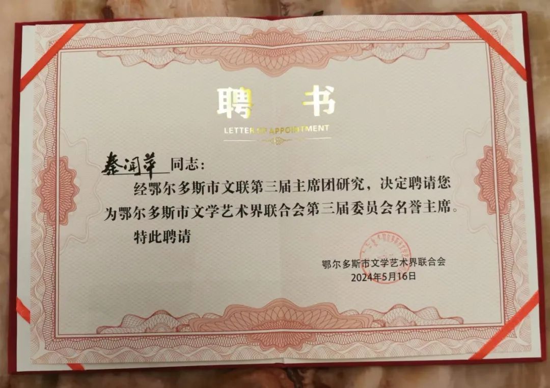 會上,鄂爾多斯市文聯第三屆主席團聘請學校黨委副書記秦聞蘋為鄂爾多斯市文學藝術界聯合會第三屆委員會名譽主席。