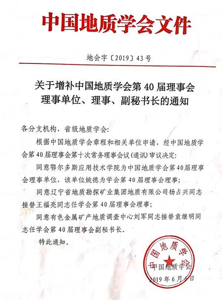 近日,學院收到中國地質學會《關于增補中國地質學會第40屆理事會理事單位、理事、副秘書長的通知》(地會字[2019] 43號)文件,我院成為中國地質學會第40屆理事會理事單位,學院院長姚德教授任學會第40屆理事會理事。