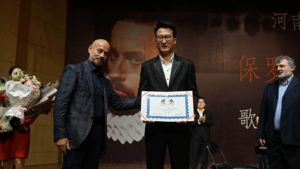 世界著名男中音歌唱家、威爾第世界藝術大使、中國國家“千人計劃” 特聘專家、賽會藝術總監Maestro Paolo Coni先生為王欣頒獎并合影留念