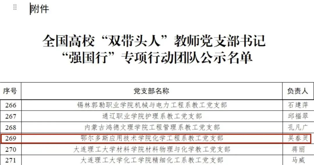 日前,教育部公示了全國高校“雙帶頭人”教師黨支部書記“強國行”專項行動團隊名單,我校化學工程系教工黨支部入選。