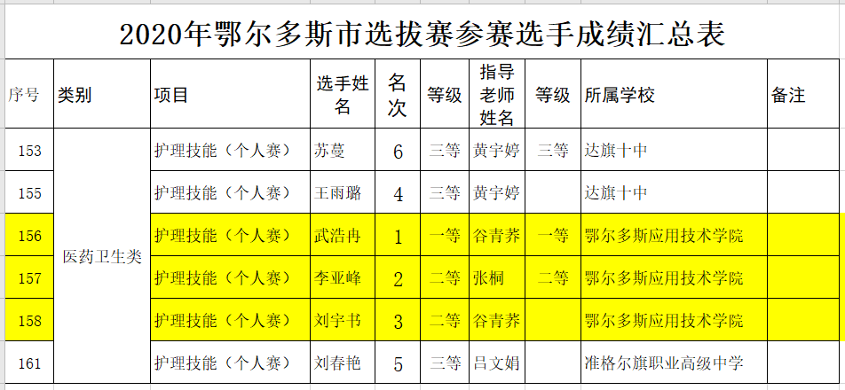2020年10月18日—19日,為期2天的全區中等職業學校學生技能大賽選拔賽在鄂爾多斯市烏審旗職業中學圓滿落下帷幕。我院繼續教育中心18級五護2班武浩冉、18級五護2班李亞峰、18級五護1班劉宇書3位同學在谷青蕎、張桐、郭蕊、李玲、常晶晶5位指導老師的精心指導和同心協力下,刻苦訓練、不懈努力,憑借出色發揮分別榮獲個人一等獎、二等獎的好成績。