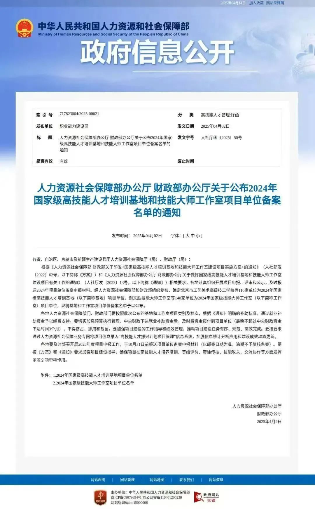 近日,人力資源社會保障部、財政部公布了2024年國家級高技能人才培訓基地和技能大師工作室項目單位備案名單,我校機械與交通工程學院王虎技能大師工作室獲評國家級技能大師工作室榮譽稱號!