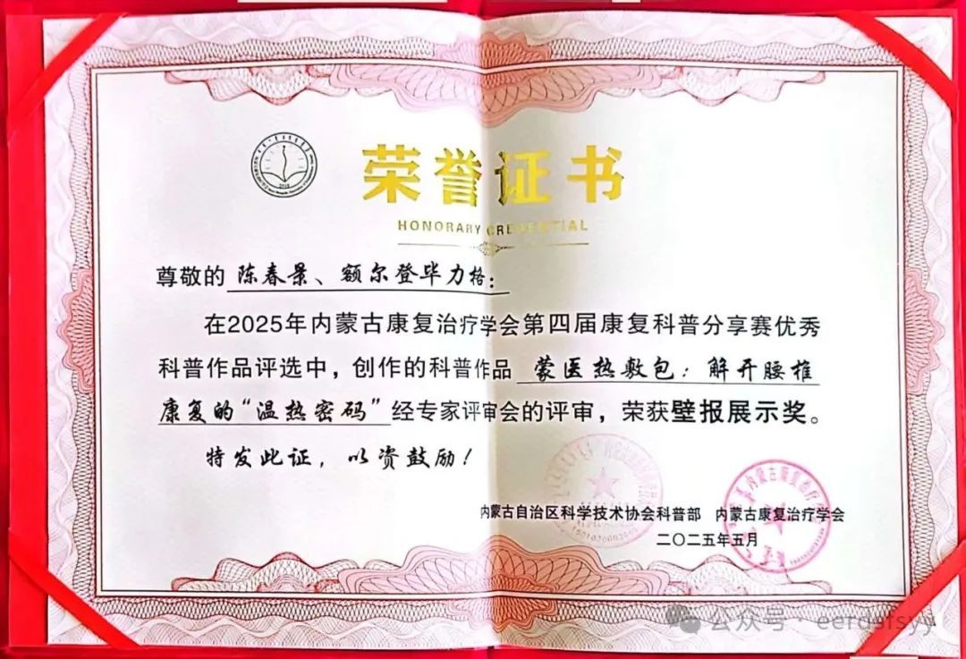 本次科普大賽是區內康復治療領域中最具影響力的科普賽事之一,吸引了全區醫療機構、院校和康復機構的積極參與。在總決賽中,我校附屬醫院醫生陳春景、付若喧、武重發的作品《以心助行——幫助患者建立美好生活》獲PT組優勝獎;醫生額爾登畢力格,陳春景的作品《蒙醫熱敷包:解開腰椎康復的“溫熱密碼”》獲得壁報展示獎。