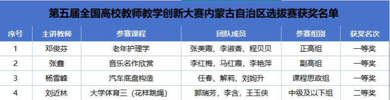 5月18日,第五屆內蒙古自治區高校教師教學創新大賽暨第五屆全國高校教師教學創新大賽內蒙古賽區選拔賽在赤峰學院舉行。我校教師獲得一等獎3項、二等獎1項。