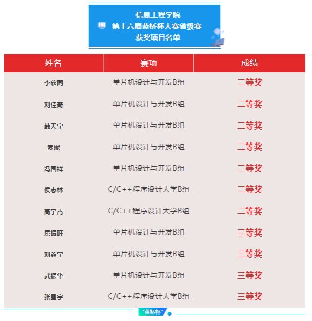 近日,第十六屆藍橋杯全國軟件和信息技術專業人才大賽省級賽成績正式公布,信息工程學院學子在省賽的激烈角逐中表現優異,斬獲省級二等獎7項、三等獎4項。