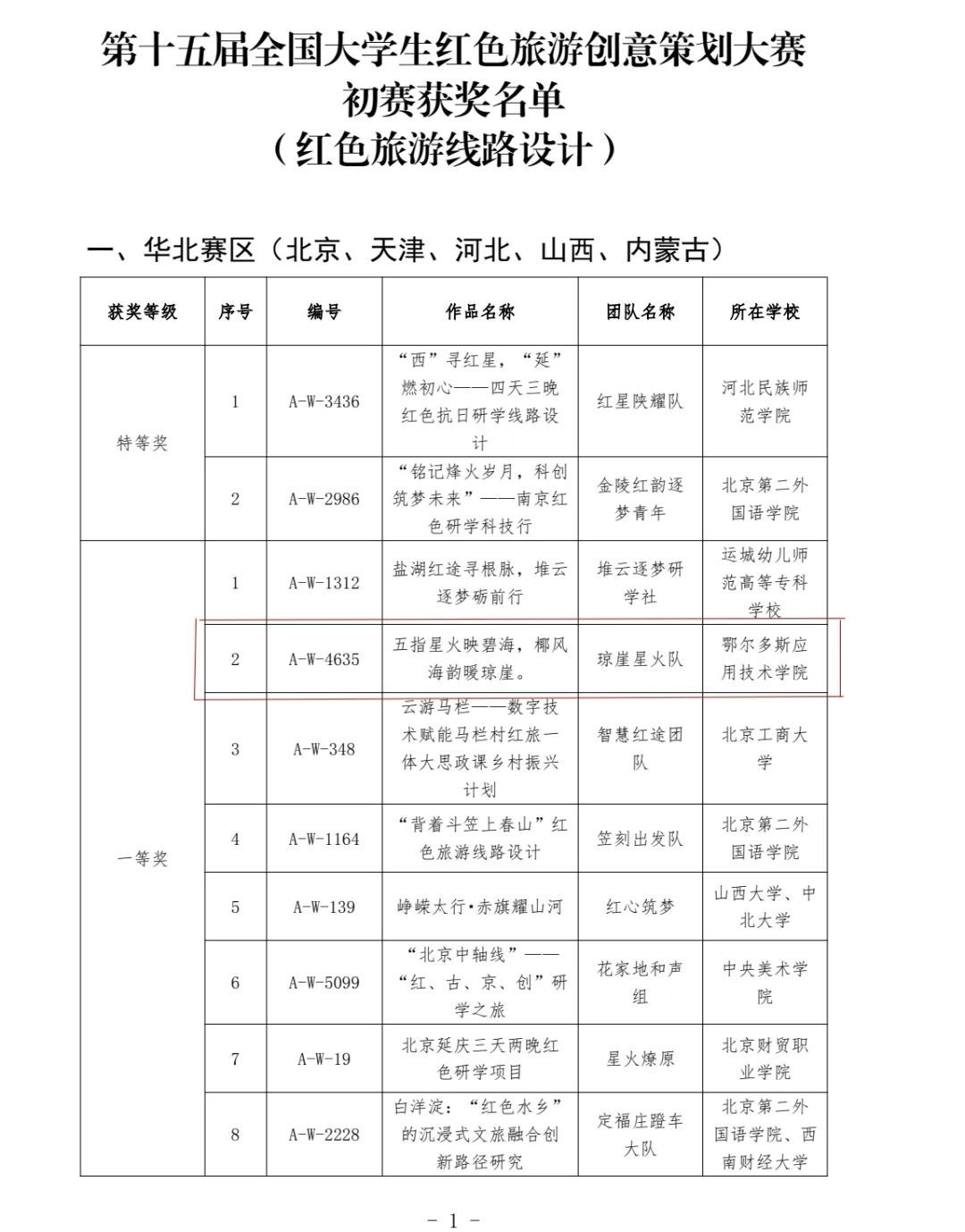 本屆大賽設置“紅色旅游線路設計”“紅色旅游營銷方案設計”“紅色旅游文創(chuàng)產(chǎn)品設計”“紅色足跡微視頻”“紅色精神微講解”“紅色故事微漫畫”6大參賽類別。經(jīng)過激烈角逐,由李雪松、烏云圖嘎拉格指導,2023級、2024級旅游管理與服務教育專業(yè)的李璐等同學組成的“瓊崖星火隊”榮獲華北賽區(qū)紅色旅游線路設計賽道一等獎。