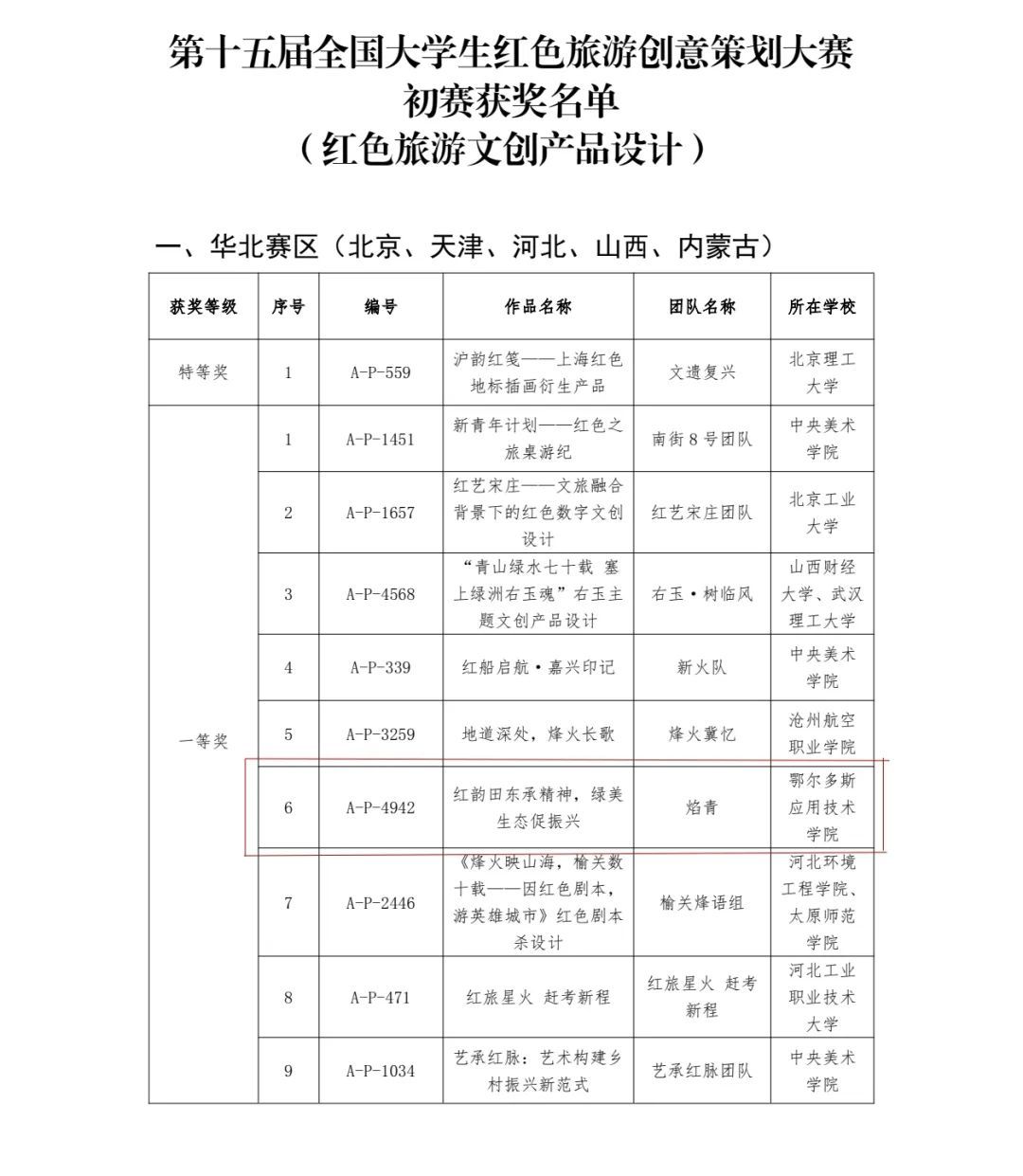 由烏尼爾、李雪松指導,2022級、2023級、2024級旅游管理與服務教育專業(yè)、2024級社會工作專業(yè)的劉夢璐等同學組成的“焰青隊”榮獲華北賽區(qū)紅色旅游文創(chuàng)產(chǎn)品設計賽道一等獎。