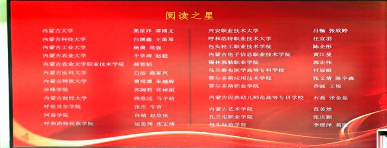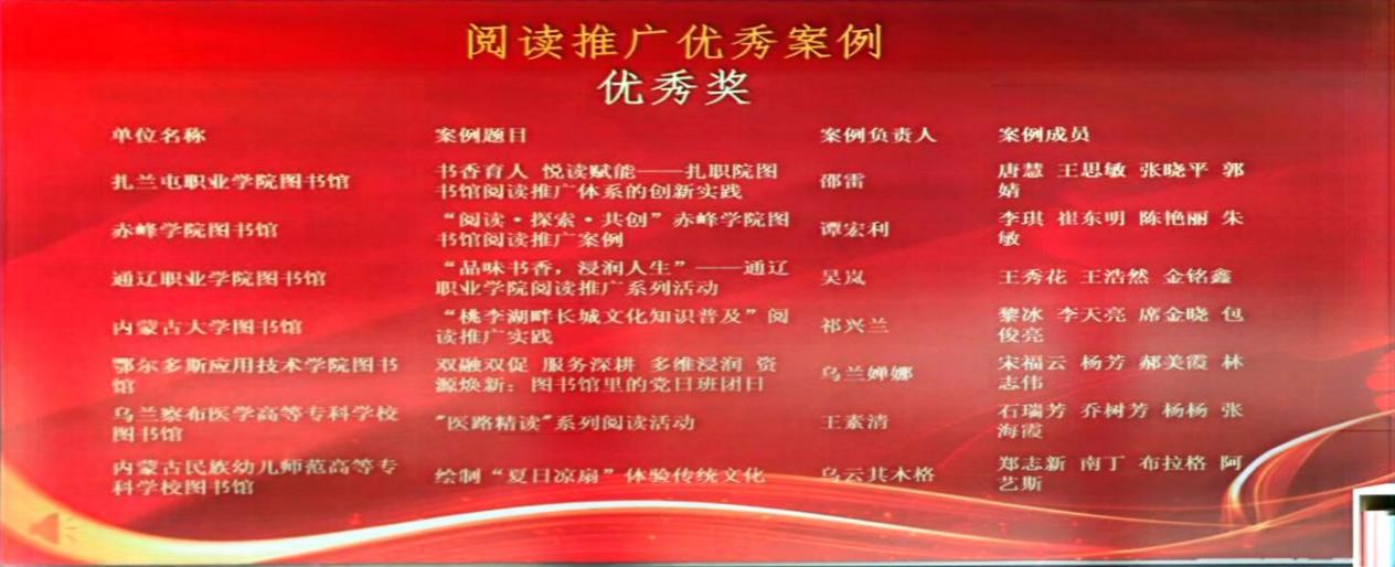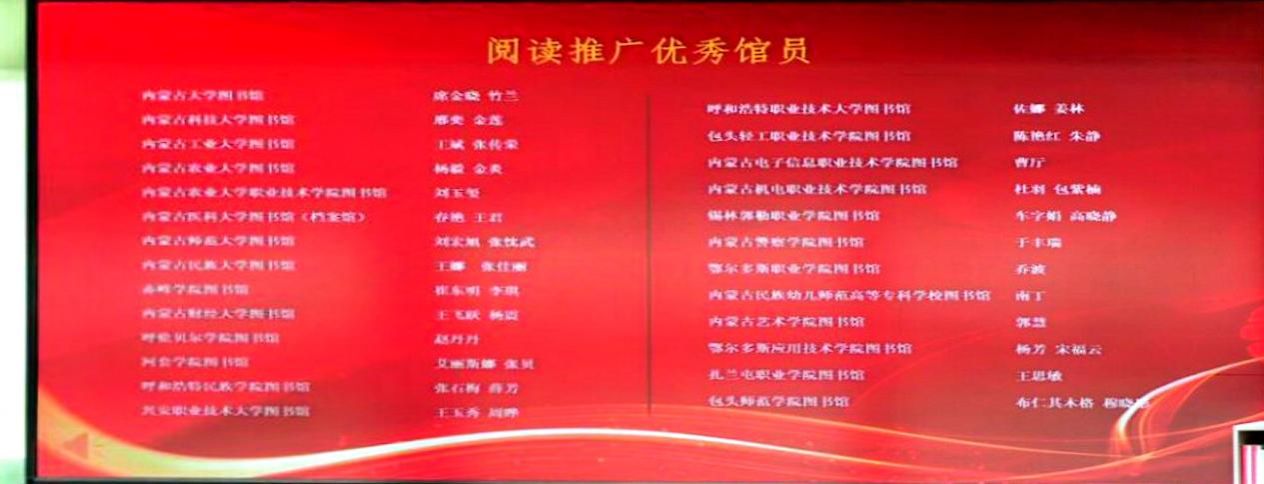 近日,“書香無界 ·智啟新章”高校圖書館創新發展暨2025年東北三省及內蒙古自治區第六屆高校圖書館館長論壇在內蒙古興安技術大學召開。我校榮獲多項榮譽。教師楊芳、宋福云榮獲內蒙古自治區高校圖書館閱讀推廣“閱讀推廣優秀館員獎”,教師烏蘭嬋娜團隊榮獲“閱讀推廣優秀案例獎”,讀書知新社團社長張文倩、圖書館第二課堂負責人陳宇森榮獲內蒙古自治區高校圖書館兩位同學獲“閱讀之星獎”。