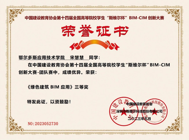 日前,第十四屆全國高等院校學生“斯維爾杯”BIM-CIM創新大賽總決賽在深圳舉行。經過激烈角逐,我校土木工程系派出的兩支學生隊伍,均贏得了團隊賽全國三等獎的好成績,同時我校榮獲組委會頒發的優秀組織獎。