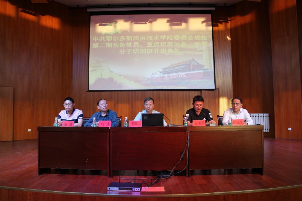 05月26日晚,在雄壯的國歌聲中,中共鄂爾多斯應用技術學院委員會黨校第二期預備黨員、重點培養對象、積極分子培訓班開班儀式在二期報告廳舉行。學院黨委書記安勝利教授作了專題黨課輔導,內蒙古大學黨委書記秦聞蘋主持開班儀式并作動員講話。學院師生預備黨員、重點培養對象、積極分子300余人參加黨課學習。