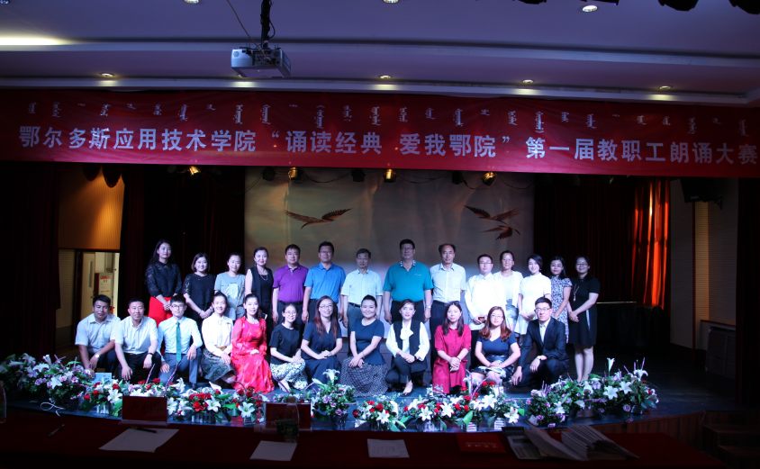 為認真貫徹落實《鄂爾多斯市總工會關于印發<全市工會組織開展慶祝自治區成立70周年群眾性文化體育活動工作方案>的通知》精神,喜迎黨的十九大勝利召開,慶祝自治區成立70周年,充分激發我院教職工的迎慶熱情和工作熱情,提高教職工語言藝術欣賞水平,豐富文化生活,營造良好的校園文化,6月19日下午,鄂爾多斯應用技術學院“誦讀經典、愛我鄂院”第一屆教職工朗誦大賽在主校區藝術樓小音樂廳隆重舉行。學院黨委書記安勝利、內大鄂院黨委書記秦聞蘋、黨委副書記楊特布信、副院長張荷亮和老師們一同觀看了比賽。國家一級播音員、鄂爾多斯市廣播電視臺主播、歷屆全國“夏青杯”鄂爾多斯賽區評委徐儷,團鄂爾多斯市委學少部部長盧利華、鄂爾多斯市總工會宣傳教育部部長包文灝,鄂爾多斯市朗誦協會會長、全民悅讀鄂爾多斯閱讀會主席、鄂爾多斯市青聯委員、國家級普通話測試員、全國青少年播音與主持專業培訓導師薩娜,鄂爾多斯市朗誦協會秘書長、全民悅讀鄂爾多斯閱讀會秘書長、省級普通話測試員、鄂爾多斯市青聯委員烏日嘎擔任比賽評委。