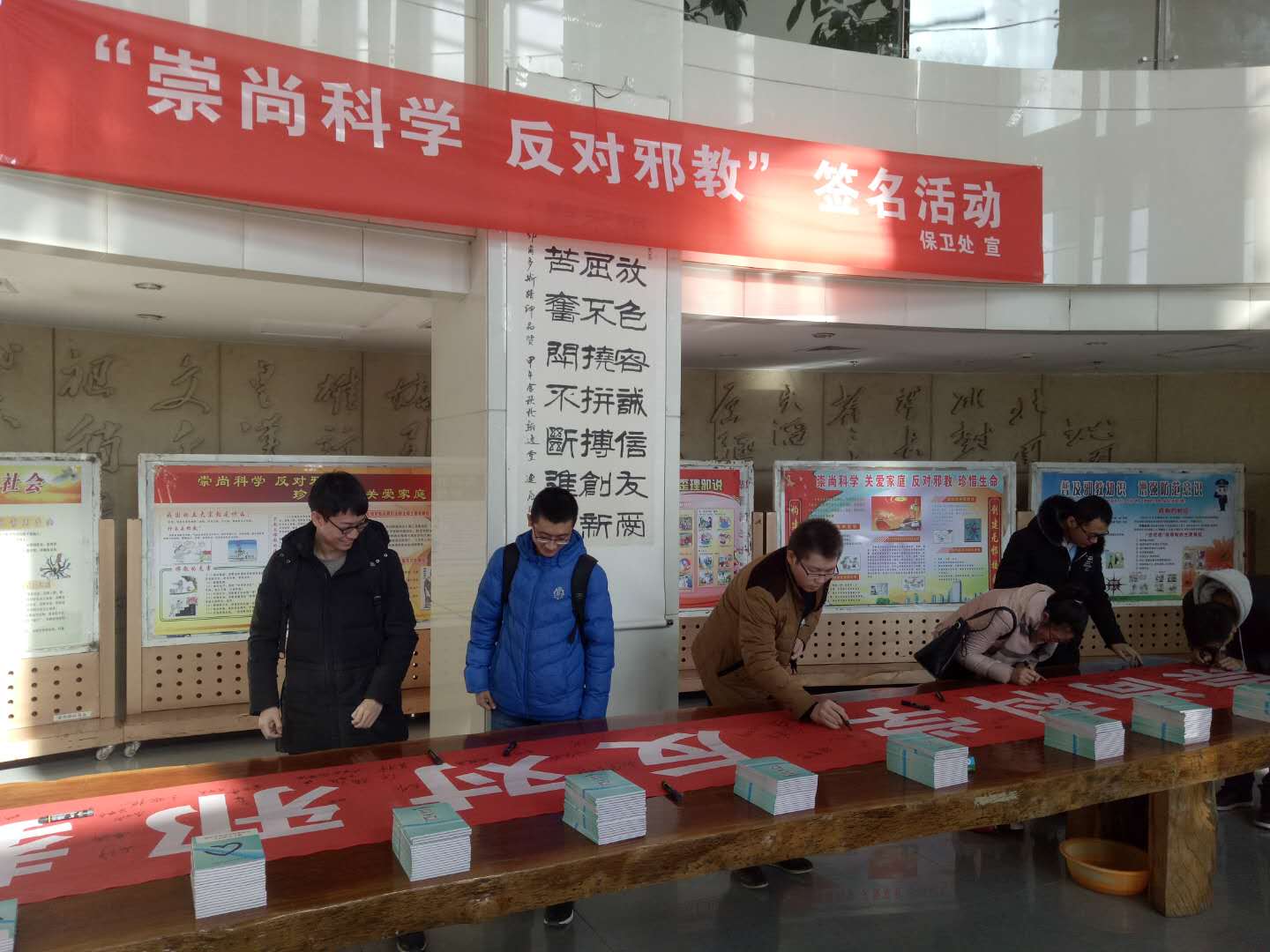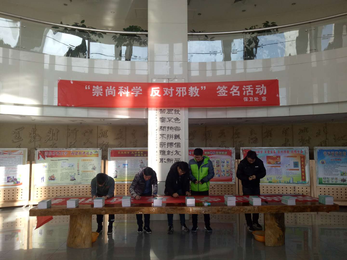 11月24日上午,保衛(wèi)處在學(xué)校圖書(shū)樓一樓大廳舉辦了“崇尚科學(xué)、反對(duì)邪教”為主題的反邪教宣傳教育活動(dòng)。活動(dòng)中,通過(guò)拉橫幅、擺展板、發(fā)放宣傳資料、現(xiàn)場(chǎng)簽名等形式,提醒廣大師生關(guān)注、參與反邪教活動(dòng),提高自我教育、自我凈化、自我防范的意識(shí)和能力,進(jìn)一步認(rèn)清邪教的本質(zhì)和危害,樹(shù)立正確的人生觀和價(jià)值觀。
