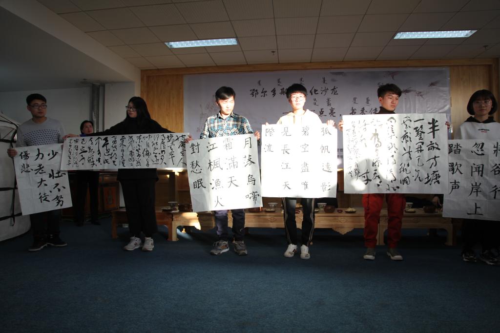 活動在詩朗誦《鄂爾多斯美酒醉鄉情》中拉開帷幕,讀書分享會開始。“寫作的技巧就是把心里想說的話說出來,這就是最好的技巧。"分享嘉賓蘇懷亮在分享《東勝六記》時這樣說到。他將自己多年的寫作經歷分享給在坐的每一位師生,希望大家能夠寫出更優美、更動人的文章。隨后莊國瑞老師為大家分享了她與陳靜老師合著的《大美伊金霍洛》這本書,她通過幽默詼諧的語言將現場的氣氛推向高潮,現場接連不斷的響起掌聲。劉海英老師也通過一些地方的特色名詞為大家推介了《鄂爾多斯風情》這樣一本風土人情濃厚的好書。分享會的同時,校領導、鄂爾多斯市書法家協會主席秦聞蘋現場揮毫并展示書法,書法社的同學們也在現場進行了書法創作展示。隨后,馬文穎、于露2位同學又向大家各推薦了一本好書。每位分享嘉賓分享結束后,都有我校藝術學院的同學為大家獻上精彩的文藝表演。分享過程中,舉行了學校圖書館地方文獻館揭牌儀式。