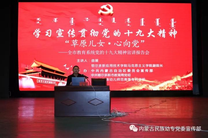 12月12日至22日,我校馬克思主義學院副院長曲展在鄂爾多斯市衛生學校、鄂爾多斯市理工學校、內蒙古民族幼兒師范高等專科學校、鄂爾多斯市蒙古族中學、鄂爾多斯市蒙古族學校、鄂爾多斯市教育局機關開展黨的十九大精神宣講,機關干部、各學校師生共1500余人聆聽了報告會。