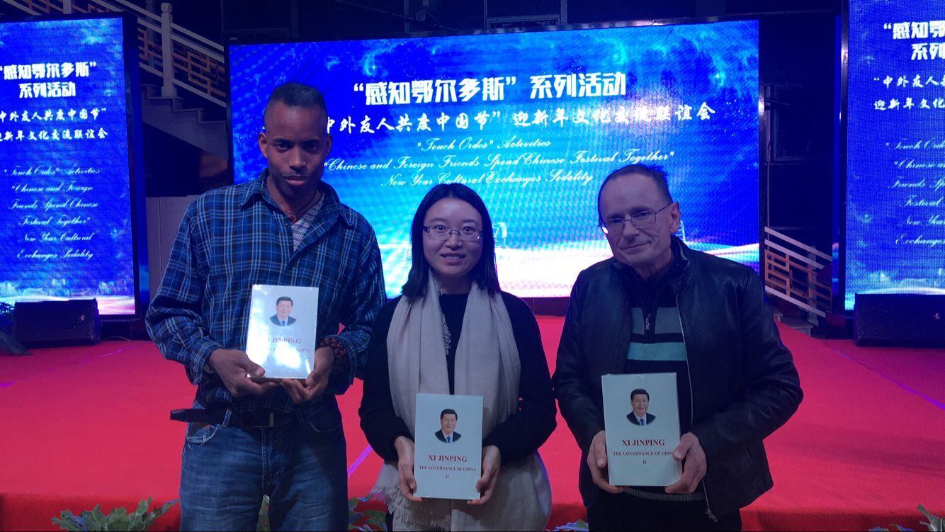 聯誼會上,活動主辦方向中外友人贈送了《習近平談治國理政》第二卷英文版、《鄂爾多斯市情手冊》英文版和《Hi 我是鄂爾多斯》畫冊。中外友人表演了各自國家的歌舞節目,介紹了在異國的學習、工作和生活感受,并一起搟餃皮、包餃子、吃餃子,感受濃濃的節日氣氛。
