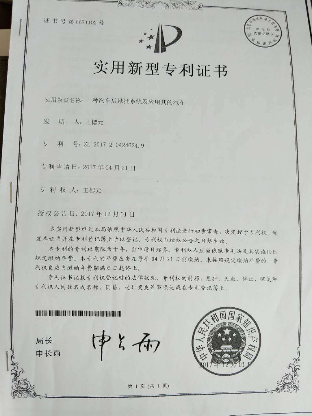 近日,由2014級(jí)土木工程專業(yè)學(xué)生王楒元自主研發(fā)的實(shí)用新型專利《一種汽車后懸掛系統(tǒng)及應(yīng)用其的汽車》獲國家知識(shí)產(chǎn)權(quán)局授權(quán),專利號(hào)為(ZL201720424634.9)。該項(xiàng)專利于2017年04月21日申報(bào),2017年12月01日正式授權(quán)公告。