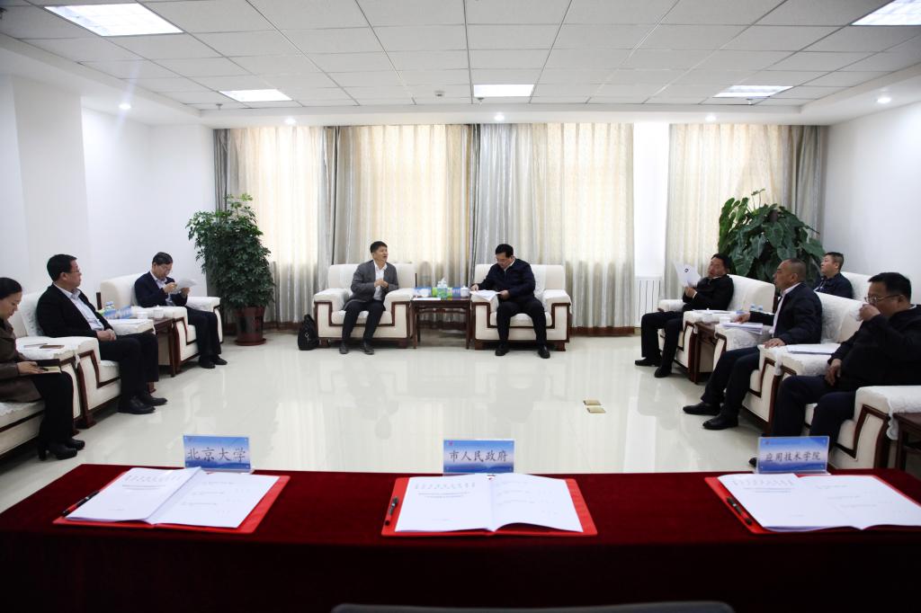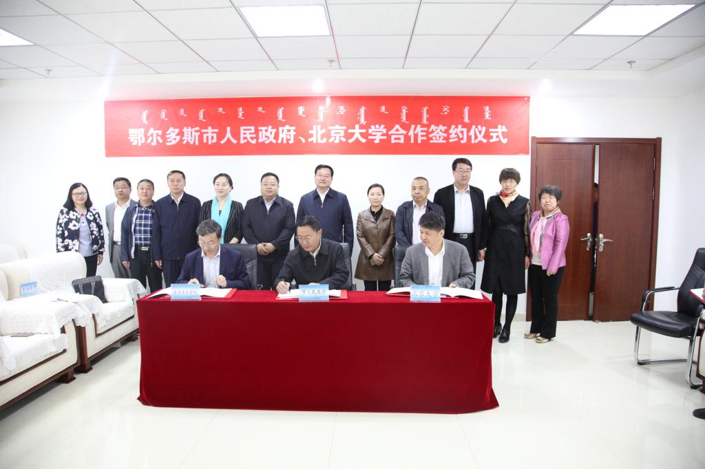 4月24日上午,鄂爾多斯市人民政府、北京大學合作簽約儀式在鄂爾多斯市高新技術區舉行。北京大學王習東教授一行,市委常委、組織部部長劉瑞杰、市人民政府副市長麻永飛及相關市直部門代表,高新區管委會領導,我校黨委書記安勝利及相關部門負責人參加簽約儀式。