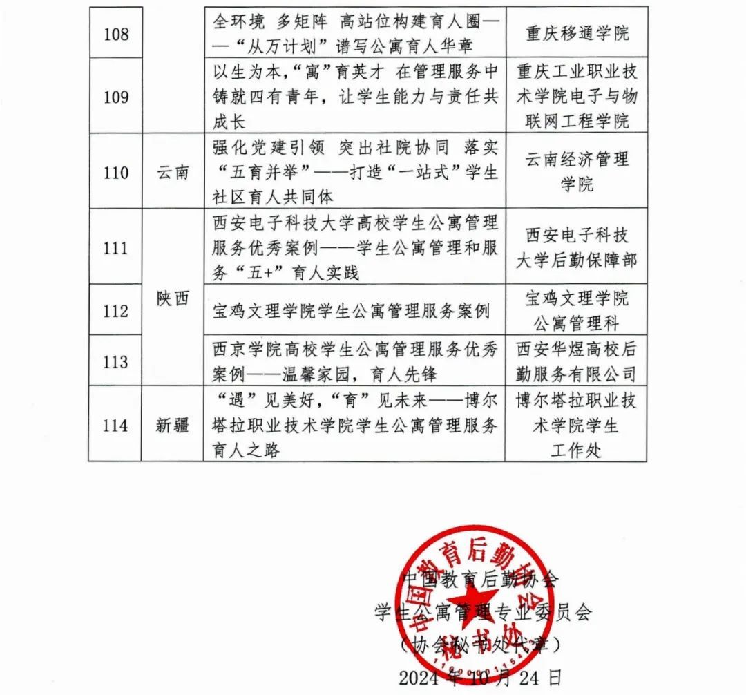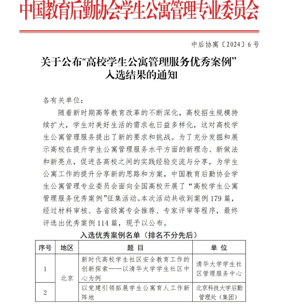 全國“高校學生公寓管理服務優秀案例”是中國教育后勤協會學生公寓管理專業委員會面向全國高校開展的征集活動。本次活動共收到案例179篇,經過材料審核、各省級寓專會推薦、專家評審等程序,最終評選出優秀案例114篇。