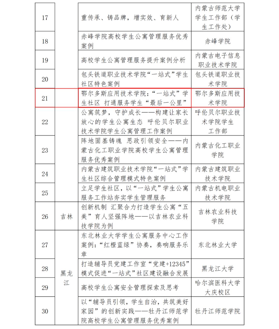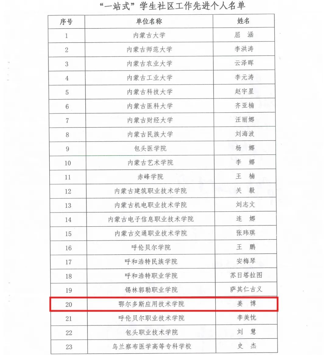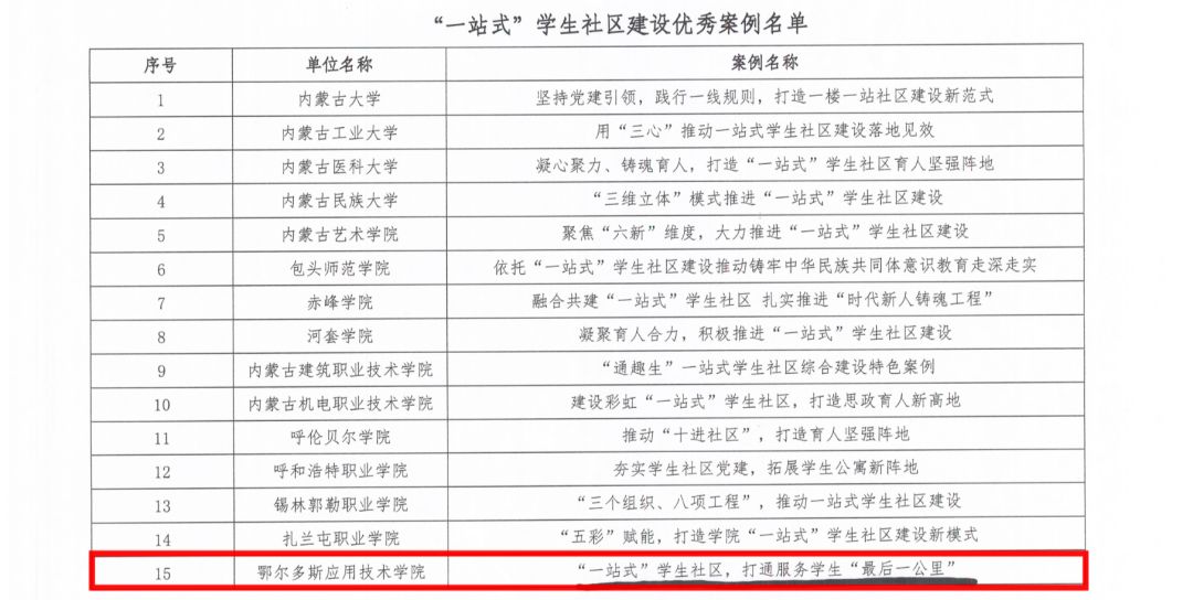 近日,我校“鄂爾多斯應用技術學院‘一站式’學生社區典型經驗”成功入選全國高校“高校學生公寓管理服務優秀案例”。此前,該案例獲評全區高校“一站式學生社區建設特色案例”。我校教師姜博獲評全區“一站式學生社區工作先進個人”。