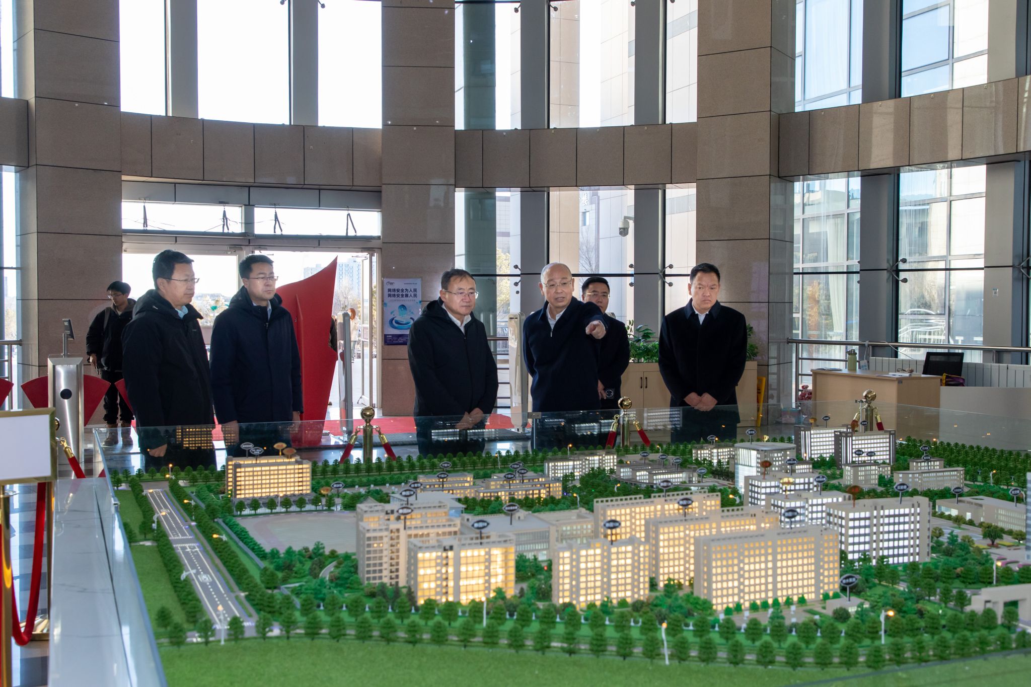 會后,朱寶江一行來到圖書館校園規劃沙盤區、大飛機學院調研,對學校在黨建工作、人才培養、專業建設、產教融合等方面成效亮點予以肯定。