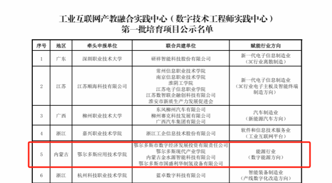 12月7日,工信部中國工業互聯網研究院公布第一批工業互聯網產教融合實踐中心(數字技術工程師實踐中心)培育項目名單,我校獲批能源行業(數字能源方向)產教融合實踐中心建設培育點。能源行業(數字能源方向)產教融合實踐中心由我校牽頭,聯合鄂爾多斯市數字經濟發展投資有限責任公司、鄂爾多斯現代產業學院、鄂爾多斯市國盛利華制氫設備有限公司單位共建。