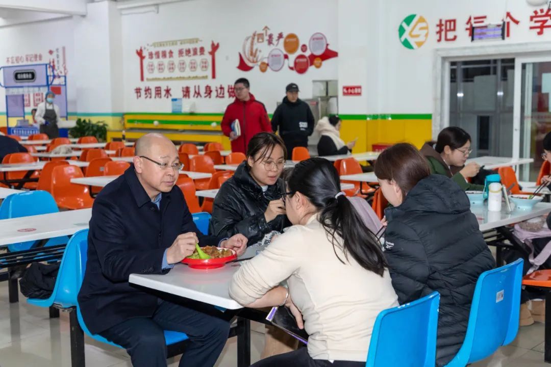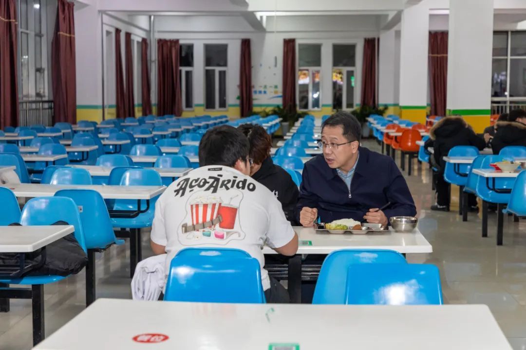隨后,李向東、宮箭一行來到學生餐廳,查看食品原材料采購、儲存、加工制作以及餐廳環境衛生等各個環節,與正在排隊點餐的同學親切交流,并與學生一同就餐。就餐過程中,親切詢問學生們對飯菜的滿意度,了解學生們在校的學習、生活需求,并號召學生們要珍惜糧食,養成良好的生活、飲食習慣。