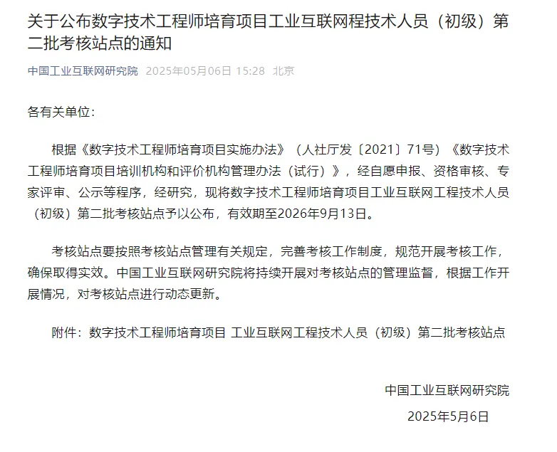 日前,工信部中國工業互聯網研究院發布數字技術工程師培育項目工業互聯網工程技術人員(初級)第二批考核站點公示名單,我校獲批成為內蒙古自治區唯一的工業互聯網工程技術人員(初級)考核站點。
