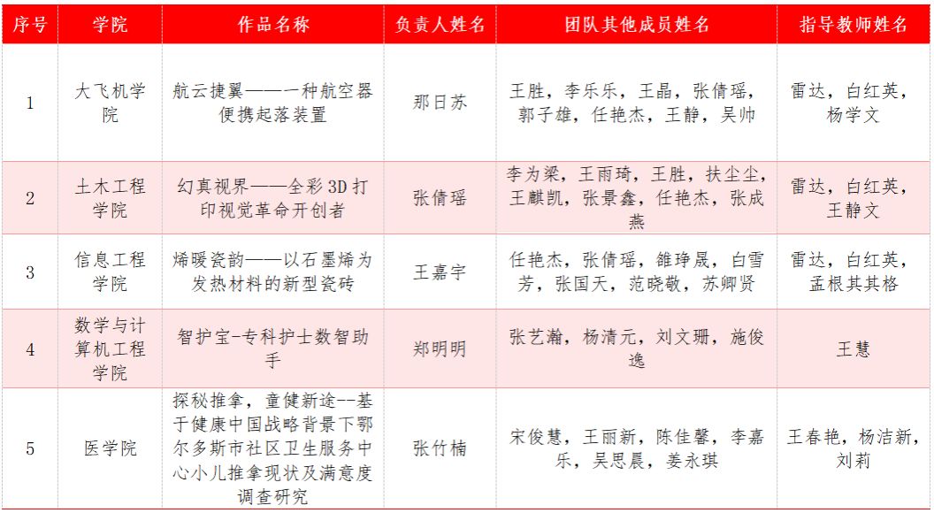 本次大賽由內蒙古自治區團委、教育廳、科學技術協會、社會科學院、學生聯合會共同主辦,內蒙古大學承辦,分為哲學社會科學類社會調查報告、自然科學類學術論文、科技發明制作三個類別。我校的5件作品從全區的1200多件作品中脫穎而出,成功入圍決賽。在比賽中,各項目團隊認真研磨、積極排練,以良好地精神面貌展現了鄂小鷹的創新能力和團隊合作意識。經過激烈角逐,我校5個項目均獲得二等獎,具體名單如下: