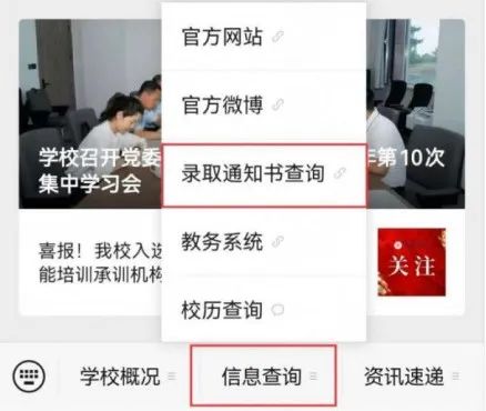 第二步:進入公眾號后,點擊菜單欄“信息查詢-錄取通知書查詢”。