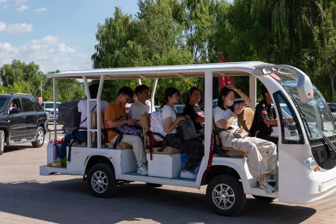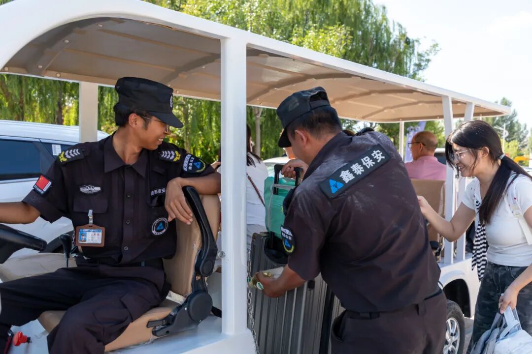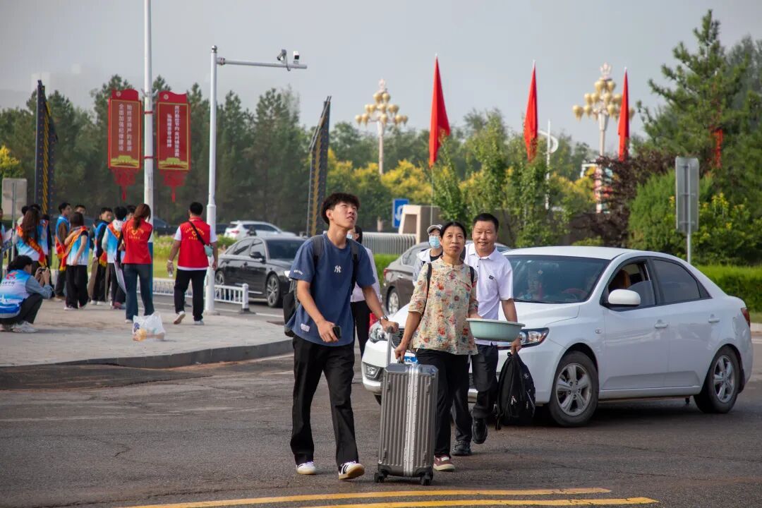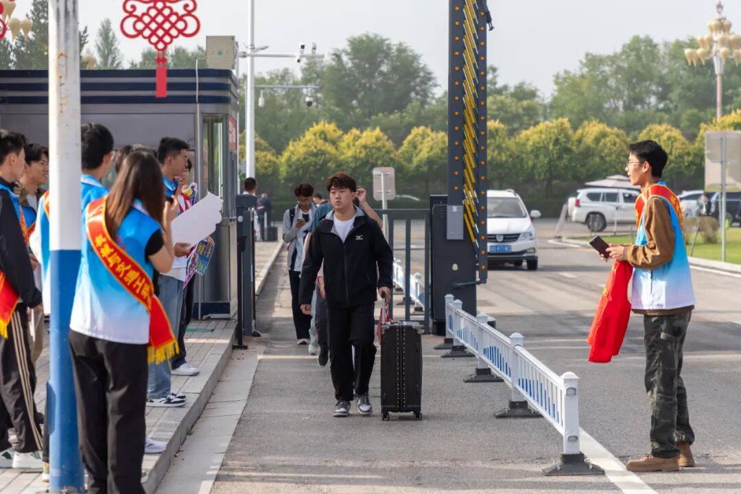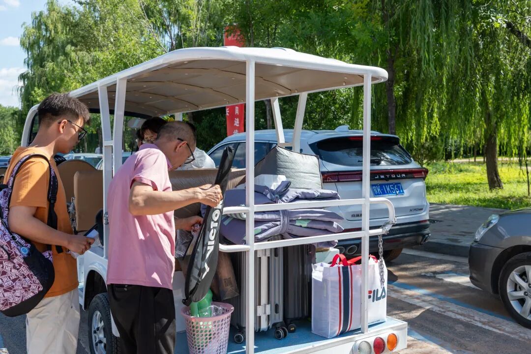 門口保安及時指引,擺渡車不停搬運行李。學校還開放了家長自駕車送行通道,熱鬧的校園處處有序有章。