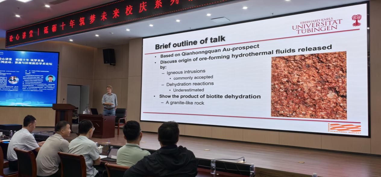 Paul Dirk Bons教授以《脫水作用:一種可能被低估的成礦流體來源》為報告主題,結合顯微構造變形及顯微構造數值模擬,研究成礦物質來源、成礦流體形成、運移以及成礦機制等方面內容。他以甘肅北山南帶前紅泉大型金礦床為例,講述了該礦床的控礦構造特征、含礦流體特征及其與金礦床形成的成因聯系等內容。