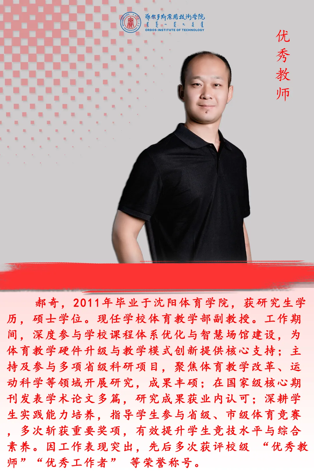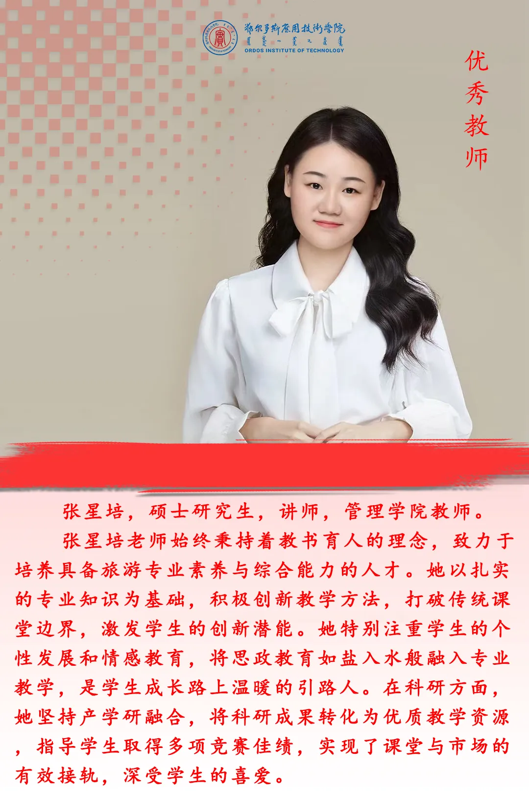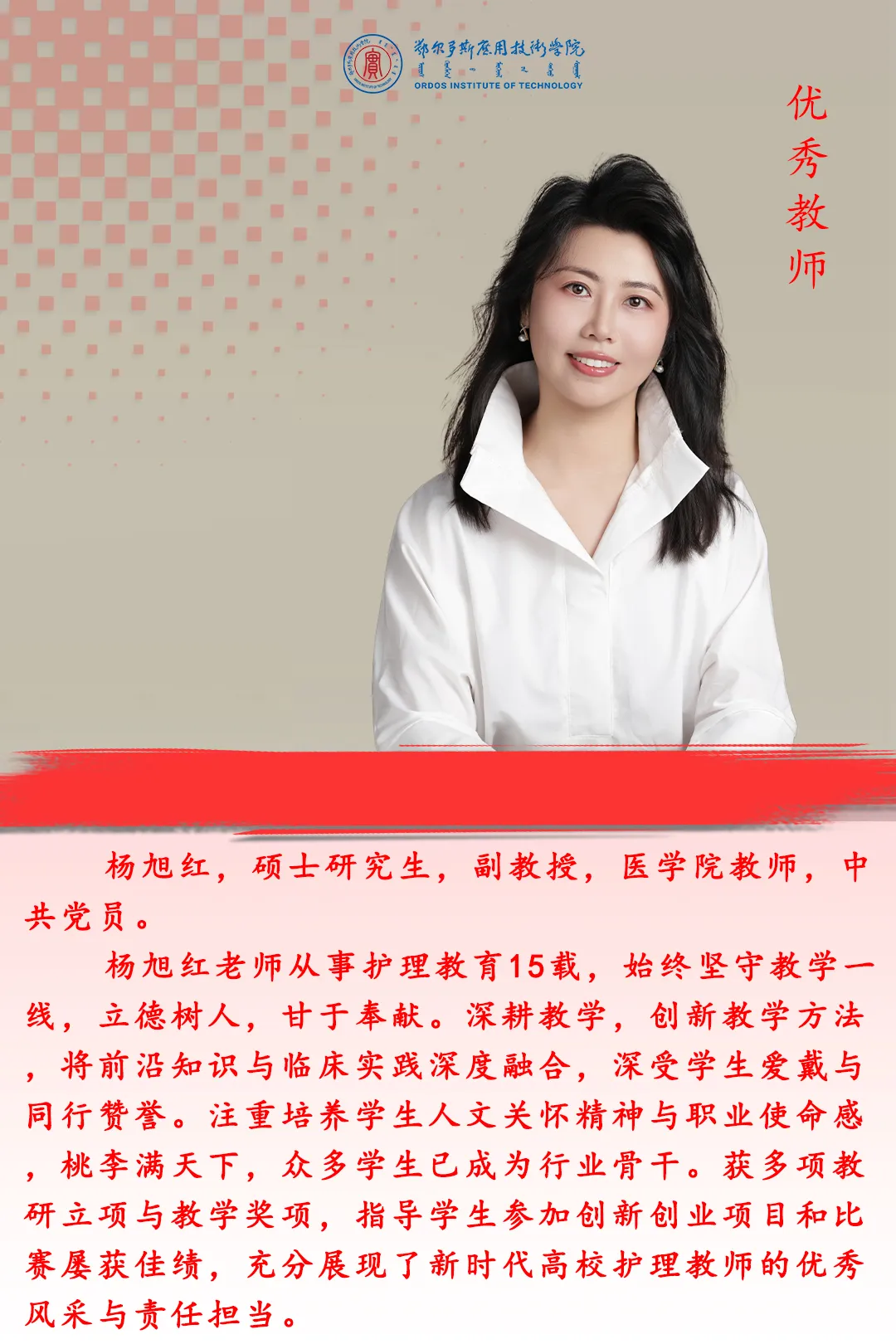 在第41個(gè)教師節(jié)來臨之際,學(xué)校將對(duì)先進(jìn)集體、先進(jìn)個(gè)人進(jìn)行表彰,以弘揚(yáng)尊師重教風(fēng)尚,激勵(lì)廣大教師牢記育人初心、擔(dān)當(dāng)育人使命。今天我們一起領(lǐng)略優(yōu)秀教師的風(fēng)采。