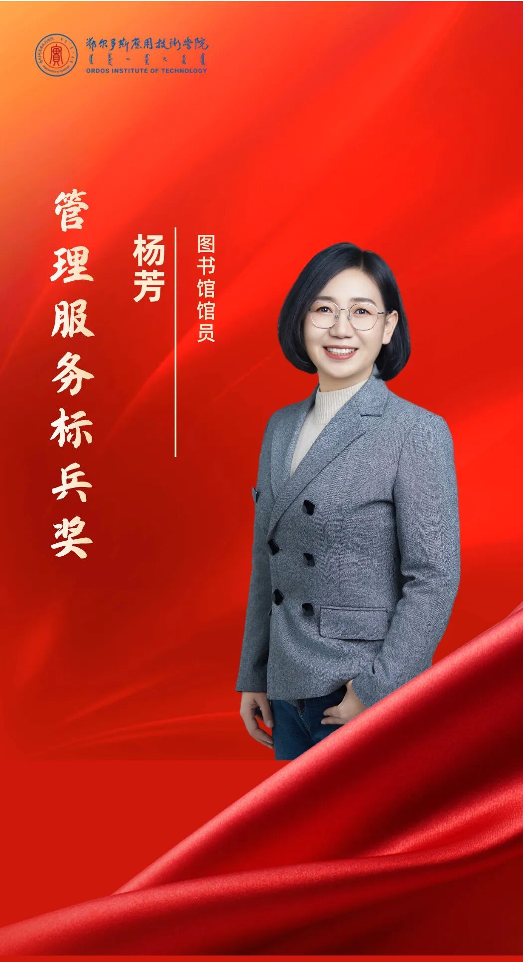 楊芳,碩士研究生,中共黨員。她始終堅守服務師生的初心,以高度的責任感和創(chuàng)新精神投身于學校建設。在建校初建,主動承擔教務處核心管理工作,保障教學秩序穩(wěn)定;回歸圖書館后,全力推動智慧化建設,主導多項圖書館軟硬件升級,顯著提升服務效能。她注重科研與實踐相結合,主持多項自治區(qū)級、校級課題,積極促進區(qū)域館際合作與發(fā)展。曾獲“優(yōu)秀共產(chǎn)黨員”“年度考核優(yōu)秀”、“華北地區(qū)優(yōu)秀館員”等榮譽。