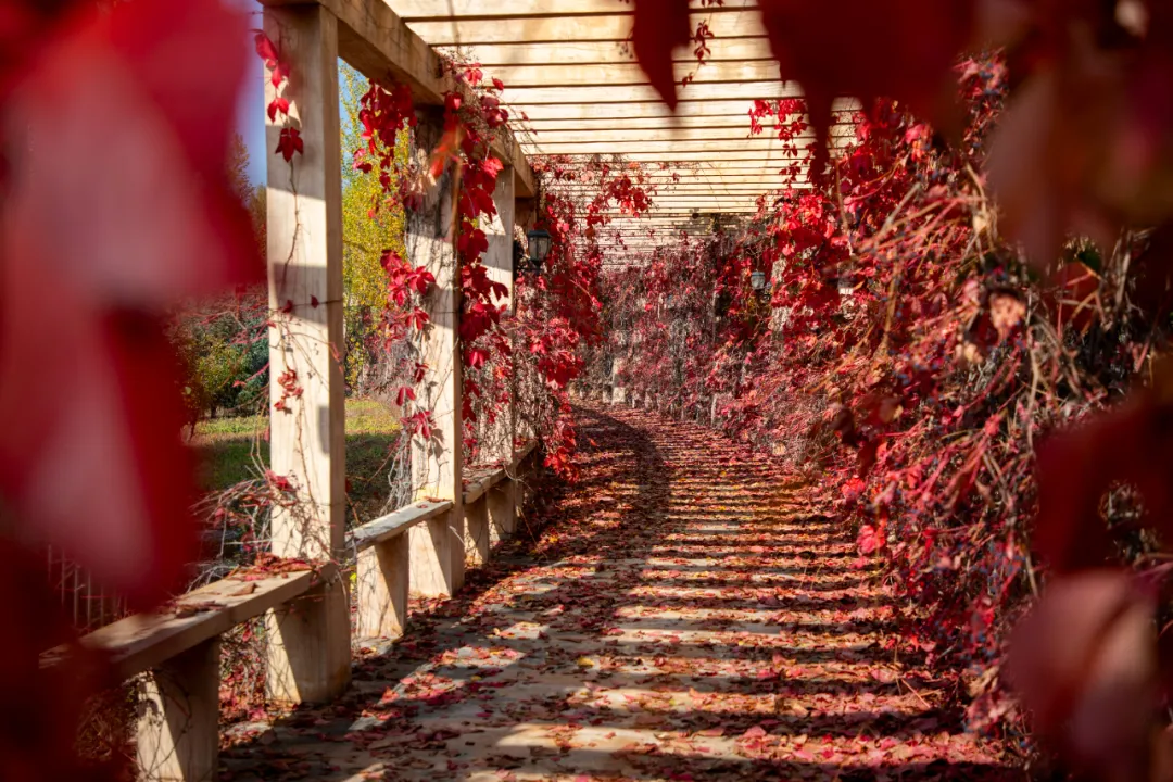 當(dāng)太陽掠過這處藤廊,鄂應(yīng)院霎時涂抹上了一層紅漆。紅葉的絢爛將點亮你的深秋,在這片紅色夢境里,邂逅獨屬于深秋的浪漫。