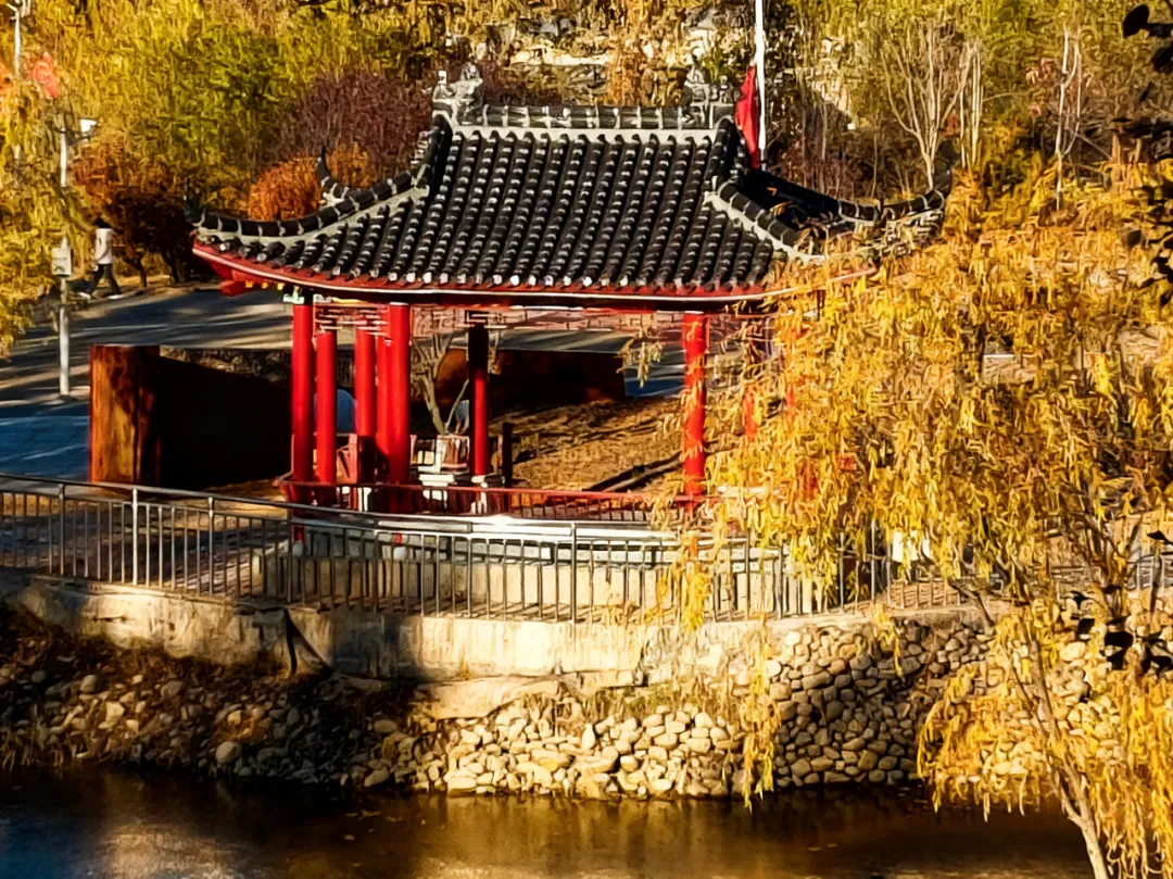 深秋的風(fēng)把古典亭閣釀成了一首立體的詩。亭臺水畔秋光老,柳色金黃詩意稠。落葉鋪就的小徑似是通往古典時光的幽徑,每一步都踏著秋的韻律。