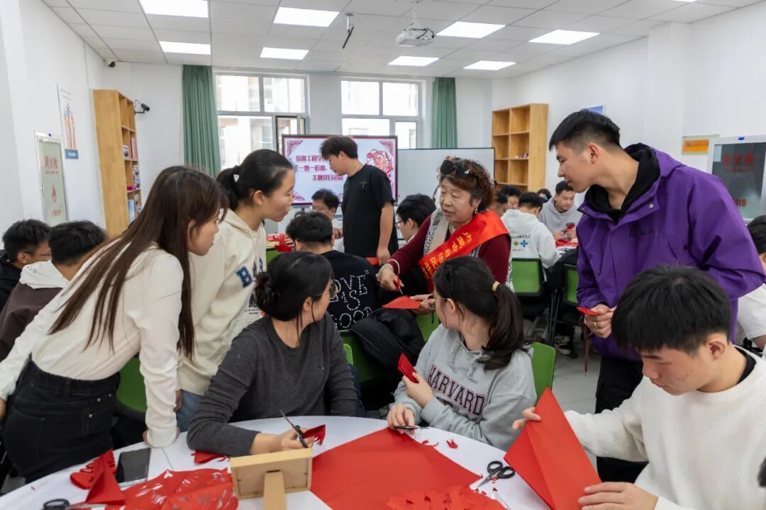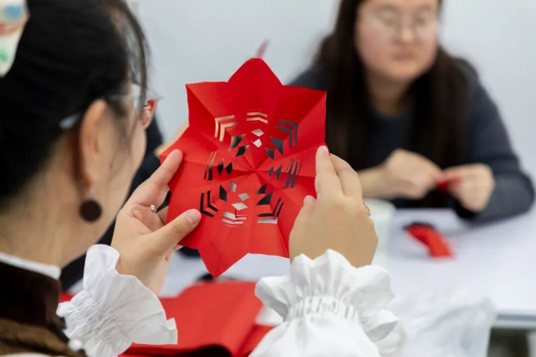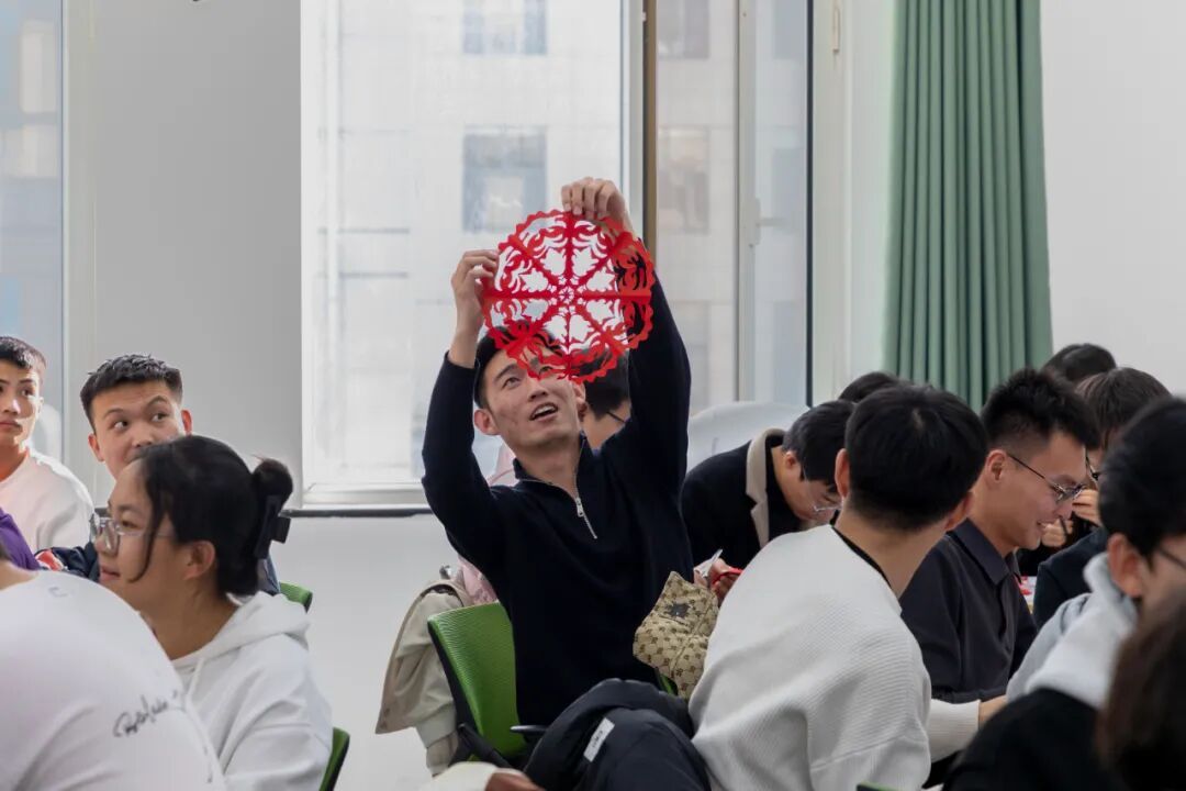 活動上,趙美玲以 “傳統窗花剪紙”為例,從折紙技法、剪紙要領到鏤空設計逐步示范,耐心指導師生動手體驗。同學們在傳統窗花基礎上融入個性化創意,一幅幅生動作品在指尖逐漸成形。活動現場剪紙聲不斷,交流氛圍熱烈,展現了非遺技藝在青年群體中的蓬勃生命力。