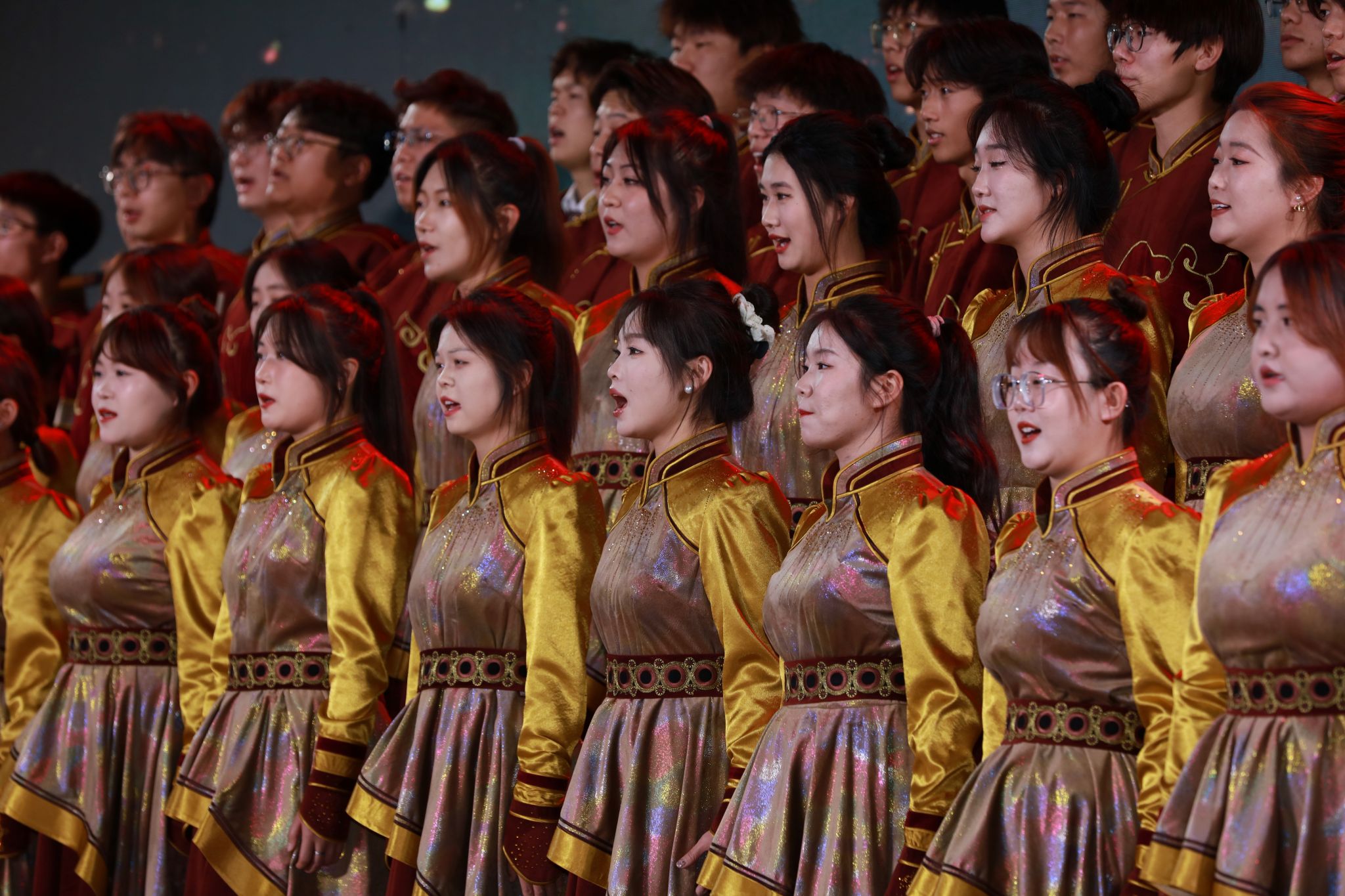 長調(diào)《班欽蘇莫》、四胡獨奏《清泉》和剛獲了自治區(qū)第七屆大學(xué)生藝術(shù)展演一等獎的群舞《阿穆爾賽罕》,不僅展示了根植鄂爾多斯文化創(chuàng)造性轉(zhuǎn)化、創(chuàng)新性發(fā)展的專業(yè)原創(chuàng)能力,也舞出了鄂應(yīng)院人對美好生活的向往。輕揚的歌聲、動感的節(jié)拍,鄂應(yīng)院學(xué)子在舞臺上恣意揮灑屬于他們的熱烈青春。