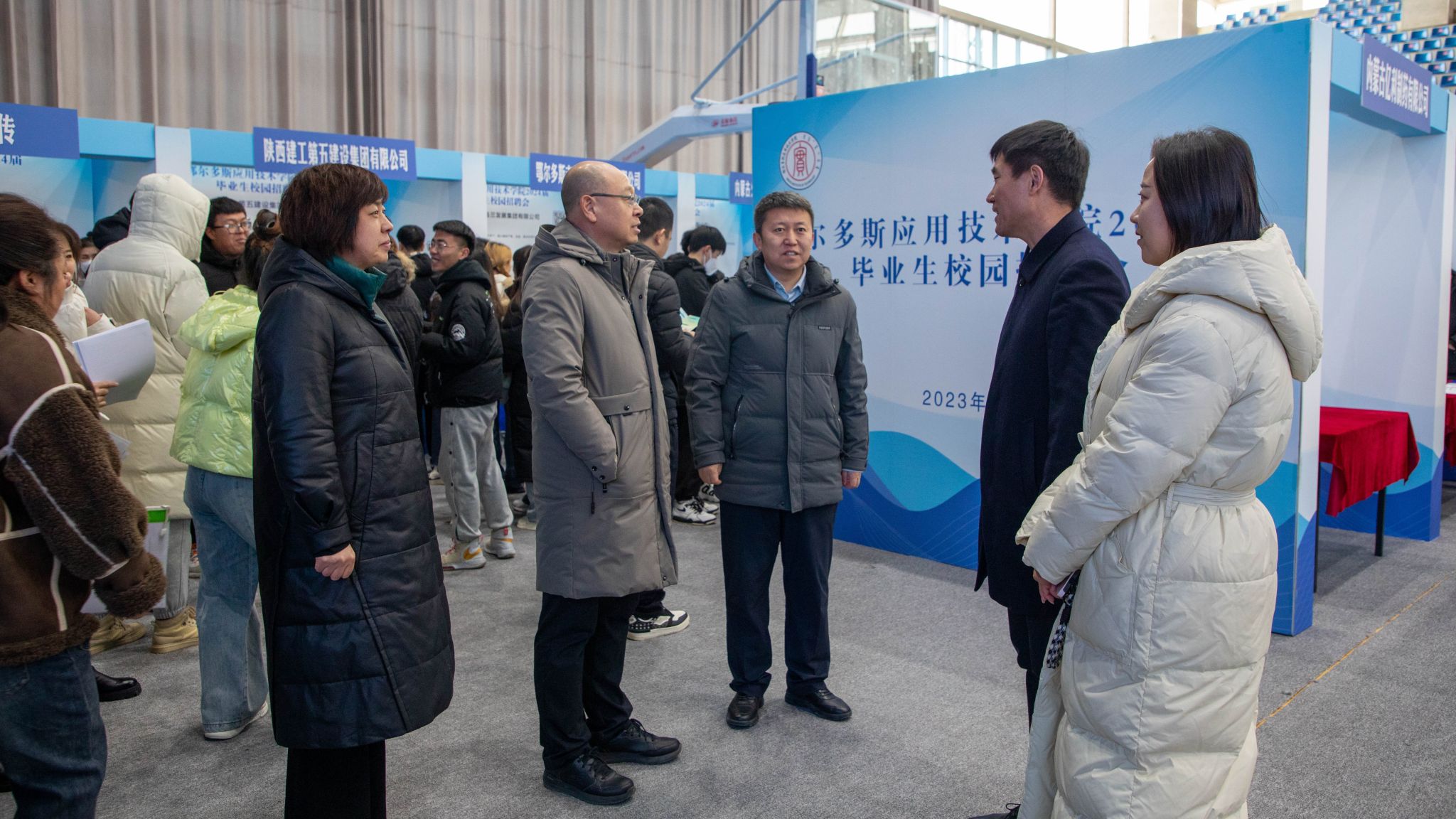 學校黨委書記、校長李向東,學校黨委委員、副校長金良以及康巴什區人社局負責人來到招聘會現場,與用人單位、畢業生溝通交流。李向東詳細了解現場用人單位的人才需求現狀,詢問畢業生就業選擇意向,鼓勵畢業生明確自身定位和職業目標,調整思想觀念,拓寬就業視野,實現科學就業。