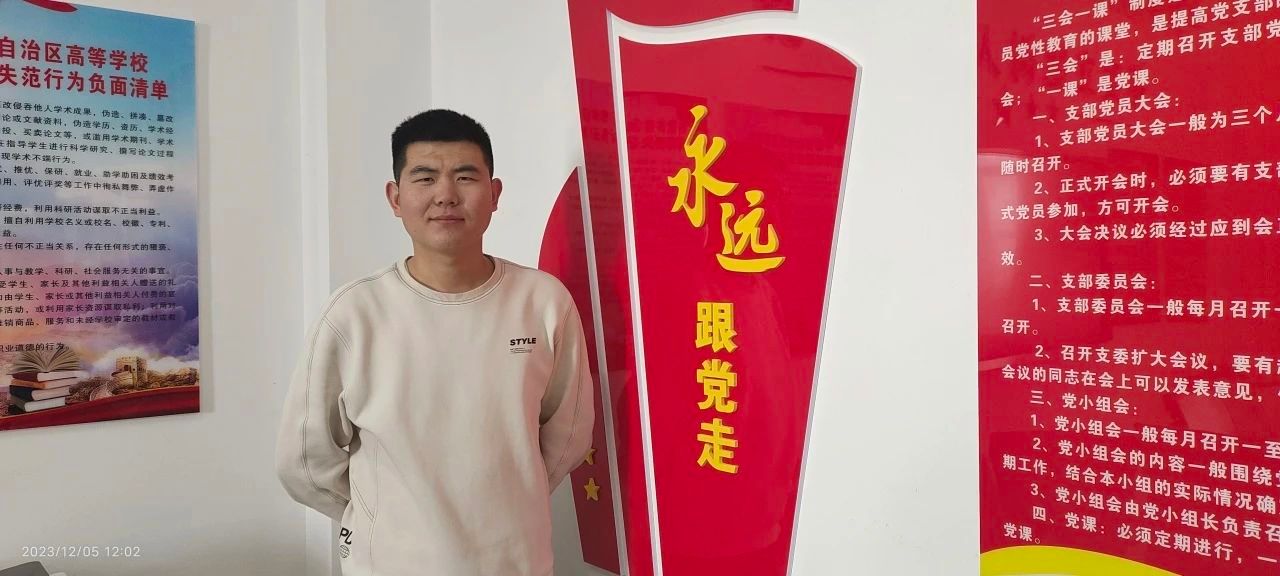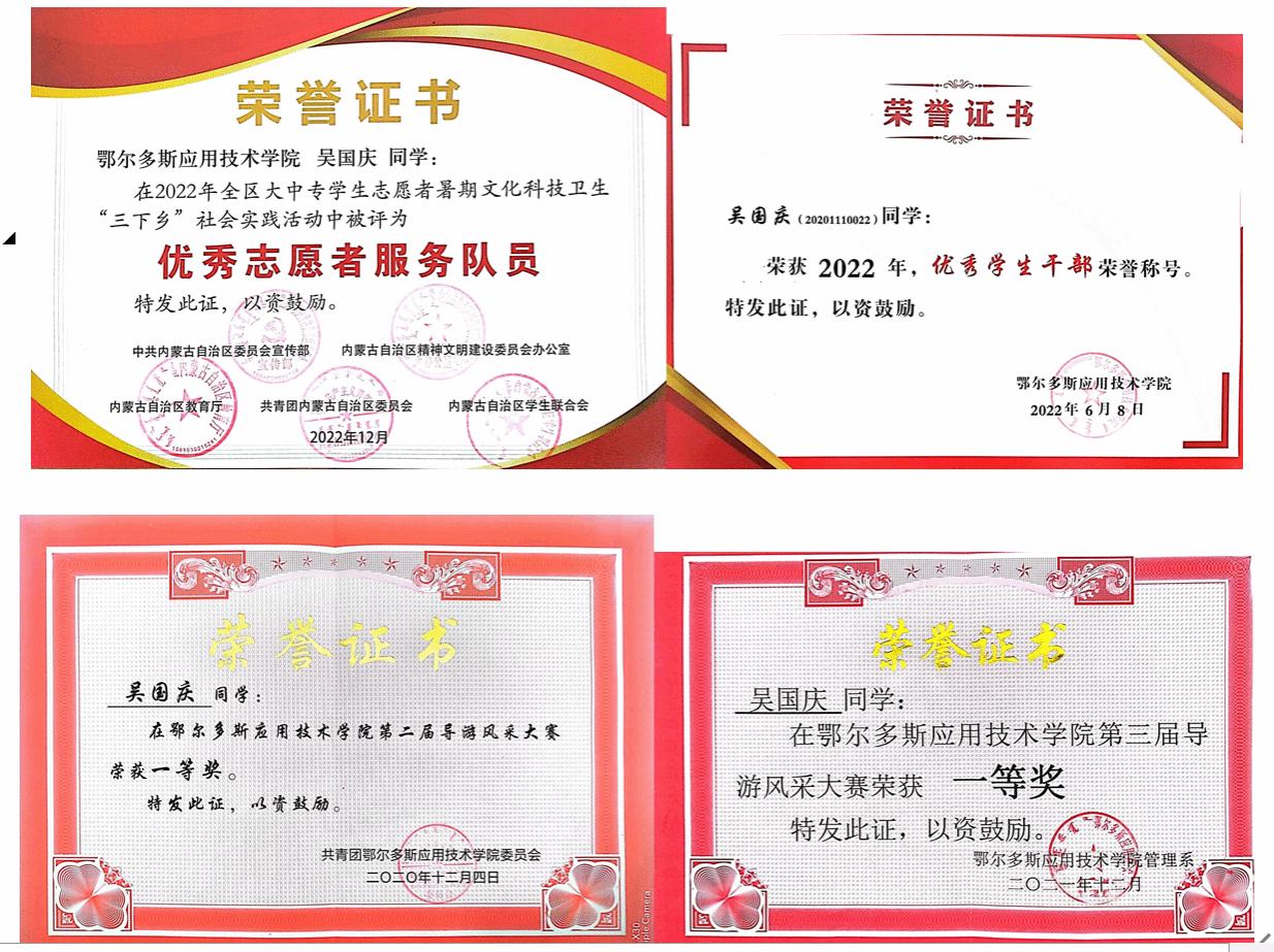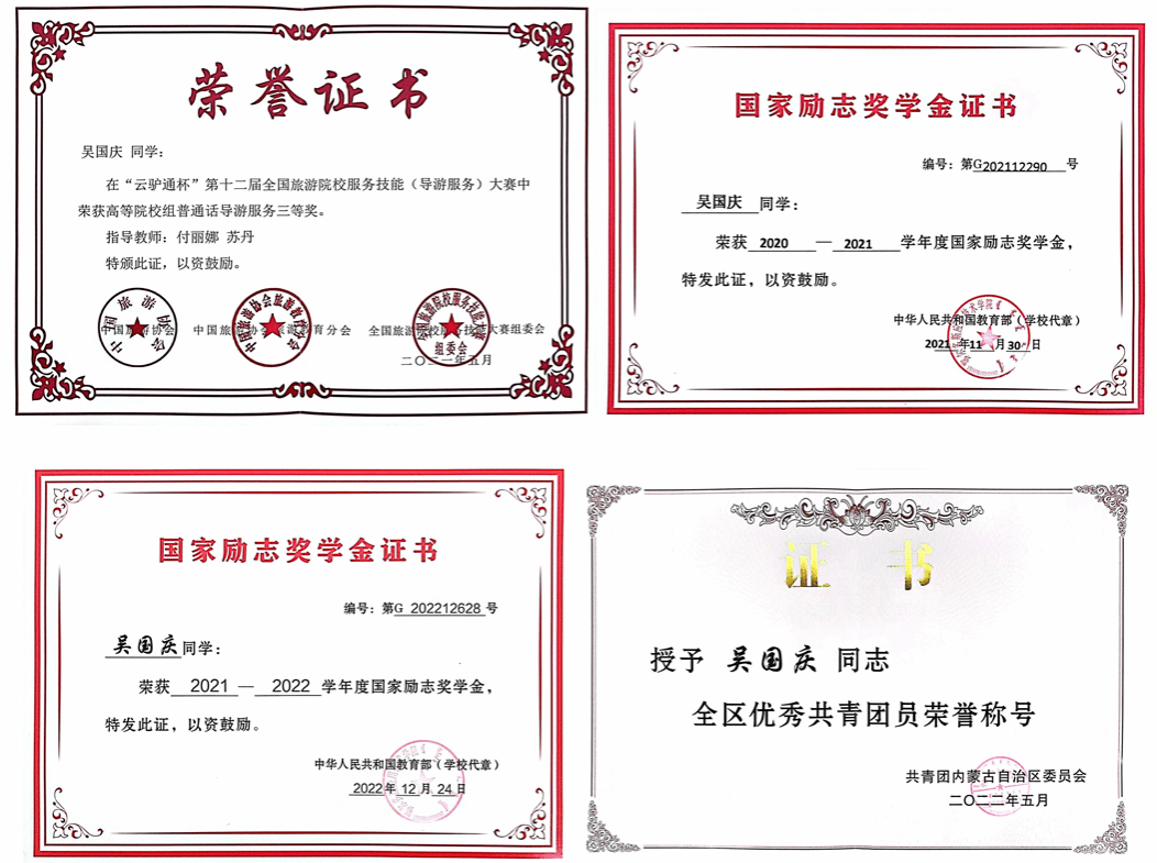 吳國慶,男,中共預(yù)備黨員,鄂爾多斯應(yīng)用技術(shù)學(xué)院管理系旅游管理與服務(wù)教育專業(yè)2020級本科生,在校期間綜合表現(xiàn)優(yōu)異,工作能力突出,現(xiàn)擔(dān)任學(xué)校學(xué)生會主席團(tuán)成員、班長。勤于求學(xué)求知、奮發(fā)努力,曾榮獲國家勵(lì)志獎(jiǎng)學(xué)金、國家級大學(xué)生自強(qiáng)之星、自治區(qū)級優(yōu)秀學(xué)生干部、自治區(qū)級優(yōu)秀共青團(tuán)員、校級2022年度優(yōu)秀學(xué)生年度人物等榮譽(yù)稱號;勇于擔(dān)當(dāng)奉獻(xiàn),主動(dòng)投身社會實(shí)踐和志愿服務(wù)活動(dòng),廣泛開展疫情防控、推普助力鄉(xiāng)村振興等工作,獲得自治區(qū)級優(yōu)秀志愿服務(wù)隊(duì)員、市級優(yōu)秀志愿者稱號、校級疫情防控優(yōu)秀學(xué)生干部;善于勤奮努力、刻苦鉆研,不斷鍛煉自己的能力和技能,并在云驢通杯第十二屆全國旅游院校服務(wù)技能(導(dǎo)游服務(wù))大賽中榮獲高等院校組普通話導(dǎo)游服務(wù)三等獎(jiǎng)、所在團(tuán)隊(duì)在第八屆中國國際互聯(lián)網(wǎng)+大學(xué)生創(chuàng)新創(chuàng)業(yè)大賽中獲得銅獎(jiǎng)、獲大學(xué)生講思政課自治區(qū)優(yōu)秀獎(jiǎng)、校級兩屆導(dǎo)游大賽冠軍。